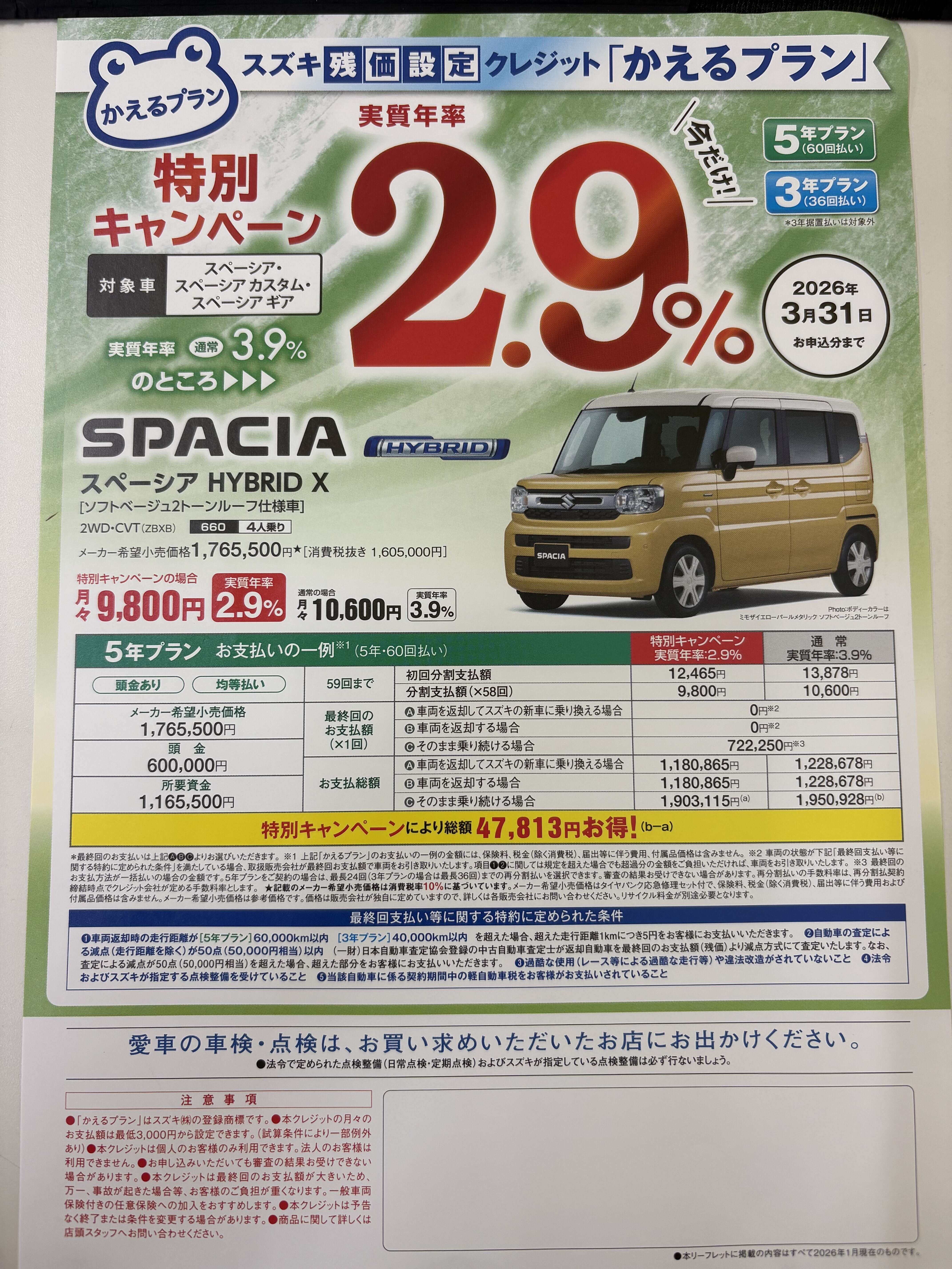 その他 2026.03.27 金利がお得な今のうちに! みなさんこんにちは! アリーナ名護の上原です! もう早いもので 3月も末になりましたね~ 新年度の準備に向けて 忙しい時期ではあると思いますが スズキではかえるプランの金利が 4月以降になると変わります! スペーシア、クロスビー、ソリオの 3車種に関しては 3月末までかえるプランの金利が 特別金利2.9%でご案内中! 是非このお得な時期に 購入のご検討を! ご相談お待ちしております!