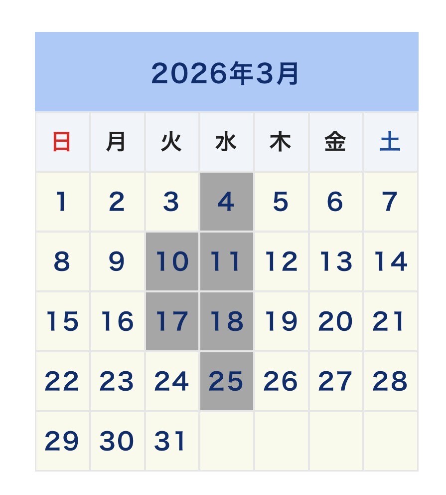 イベント/キャンペーン 2026.03.02 3月定休日のご案内 こんにちは 先週から暖かい日が続きますね 花粉も飛び始めていますのでお気を付けください 本日は、3月の定休日をご案内します 今月も皆様のご来店お待ちしております