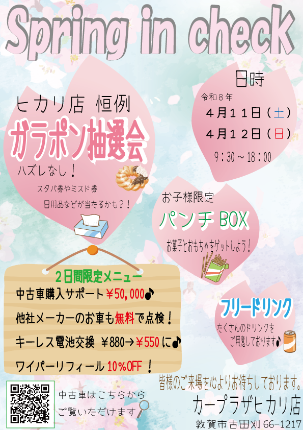 イベント/キャンペーン 2026.04.07 スプリングインチェック開催!!!!! ※このイベントは終了しました 皆様、こんにちは 当店のブログをご覧いただき誠にありがとうございます イベントのお知らせです 2026年4月11日(土)・12日(日)9:30~18:00 Spring in check 開催 2日間限定のお得がたくさん ヒカリ店では、恒例のガラポン抽選会を行います お子様にも楽しんでいただける企画もご用意しております たくさんのご来場をお待ちしております