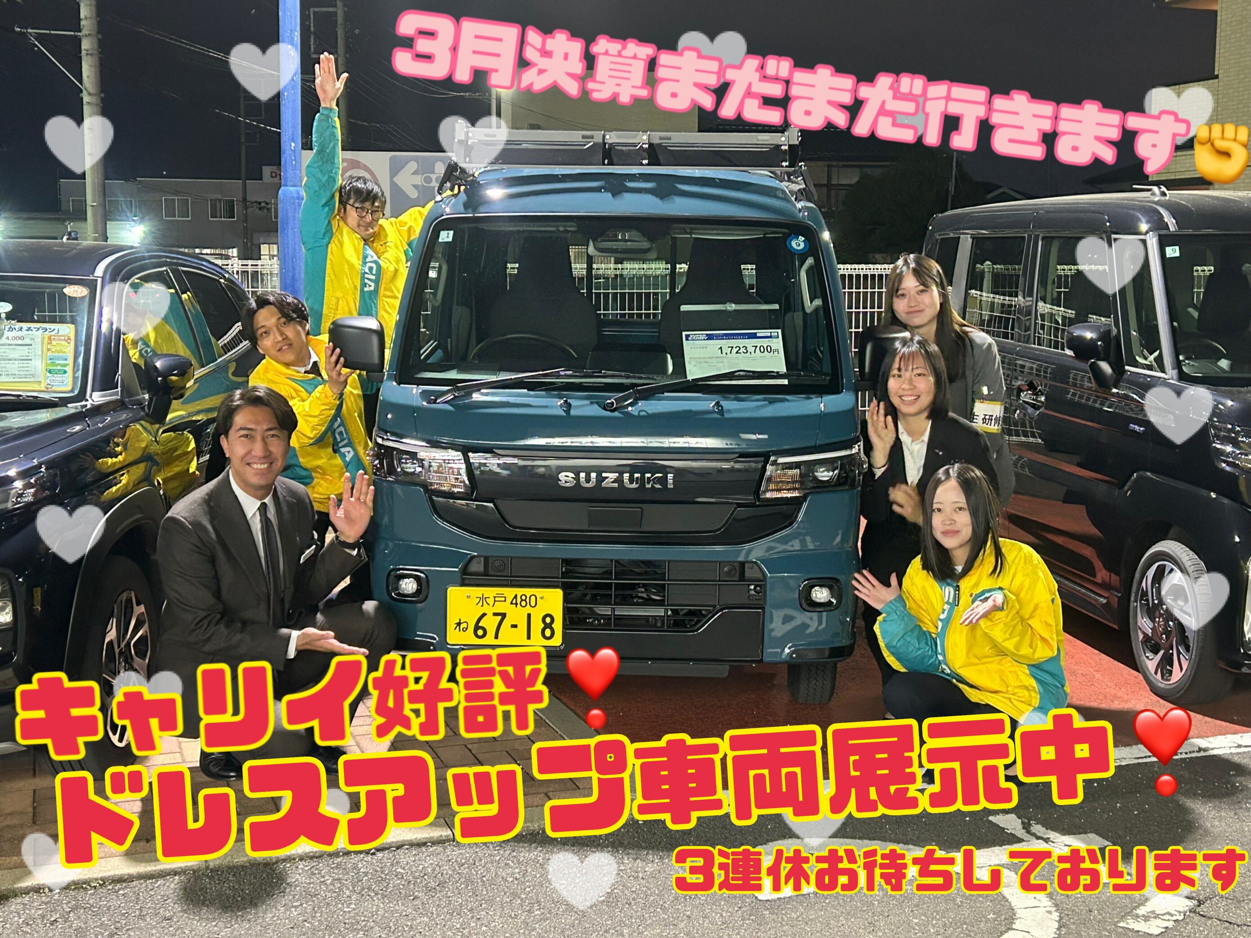 イベント/キャンペーン 2026.03.16 3連休がきます!スズキの車は燃費も魅力です! ※このイベントは終了しました こんにちは いつもアリーナ水戸平須のHPをご覧いただき ありがとうございます 3月もあっという間に 半分が過ぎました! 先週はホワイトデーもありましたね 渡すお菓子で意味が違うなんて話もありますが 私は美味しければ意味は気にしない派です 皆さまがそれぞれ楽しくイベント事を 満喫出来ていたら良いなと思います そして 3月唯一の3連休がきます! 水戸平須店では今週末も大決算 商談会を実施予定です 皆さまはお車で 重視するポイントはありますか? 最近またガソリン代が上がってますね スズキのお車は燃費の良い車種が沢山 「燃費が決め手だった!」と、 お客様から言って頂くことも 車選びのポイントの1つとして 意識してみてください 20日(金)21日(土)22日(日) 皆さまの予定を是非、 水戸平須店にください 3月決算も終盤です!! スタッフ一同頑張ります