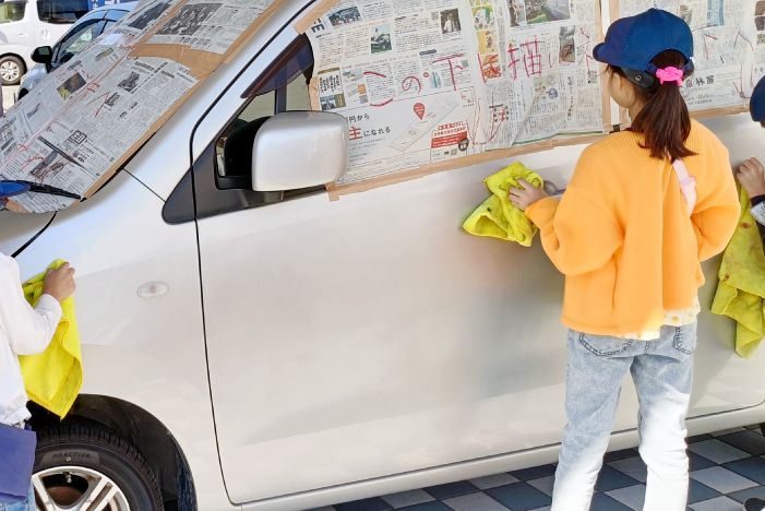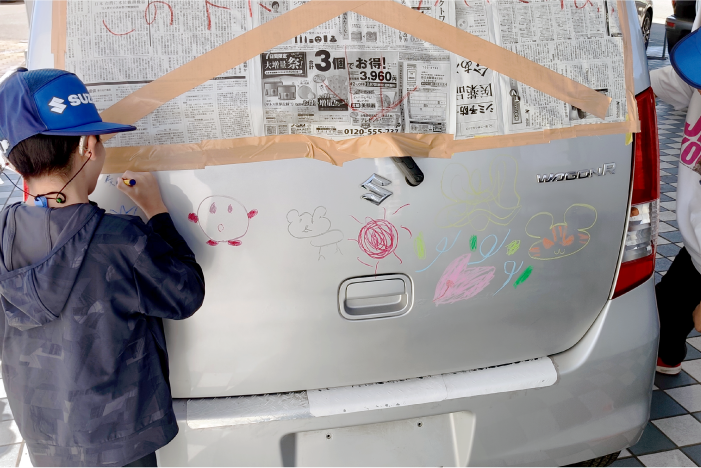 そしてお楽しみの、車にお絵かき体験!