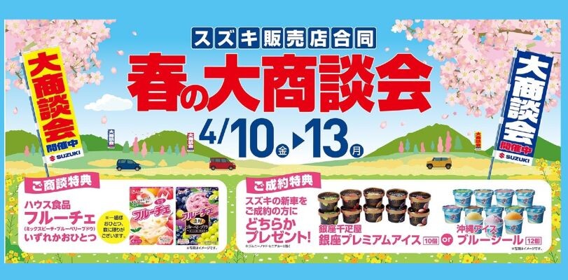 イベント/キャンペーン 2026.04.07 春の大商談会 4月10日(金)~13日(月)開催! キャンペーン期間:2026.04.10~2026.04.13 4月10日(金)~13日(月) 春の大商談会 開催いたします 商談特典 成約特典 皆様のご来店お待ちしております