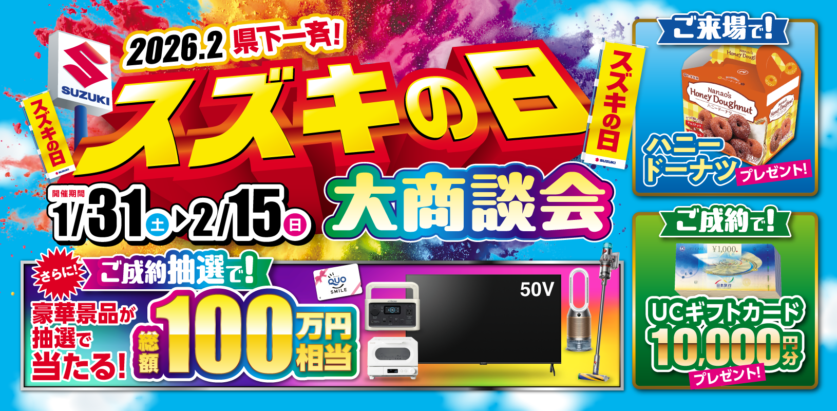 イベント/キャンペーン 2026.01.28 スズキの日 !! キャンペーン期間:2026.01.31~2026.02.15 1月31日から2月15日はスズキの日 スペシャルプライス車 ご成約特典をご用意してお待ちしております。 黄色い『スズキの日』の のぼりが目印です。 残価設定クレジット『かえるプラン』 特別キャンペーン実施中!! 詳しくは ↓ https://www.suzuki-finance.co.jp/news/cp2601/ 皆様のご来店を心よりお待ちしております。