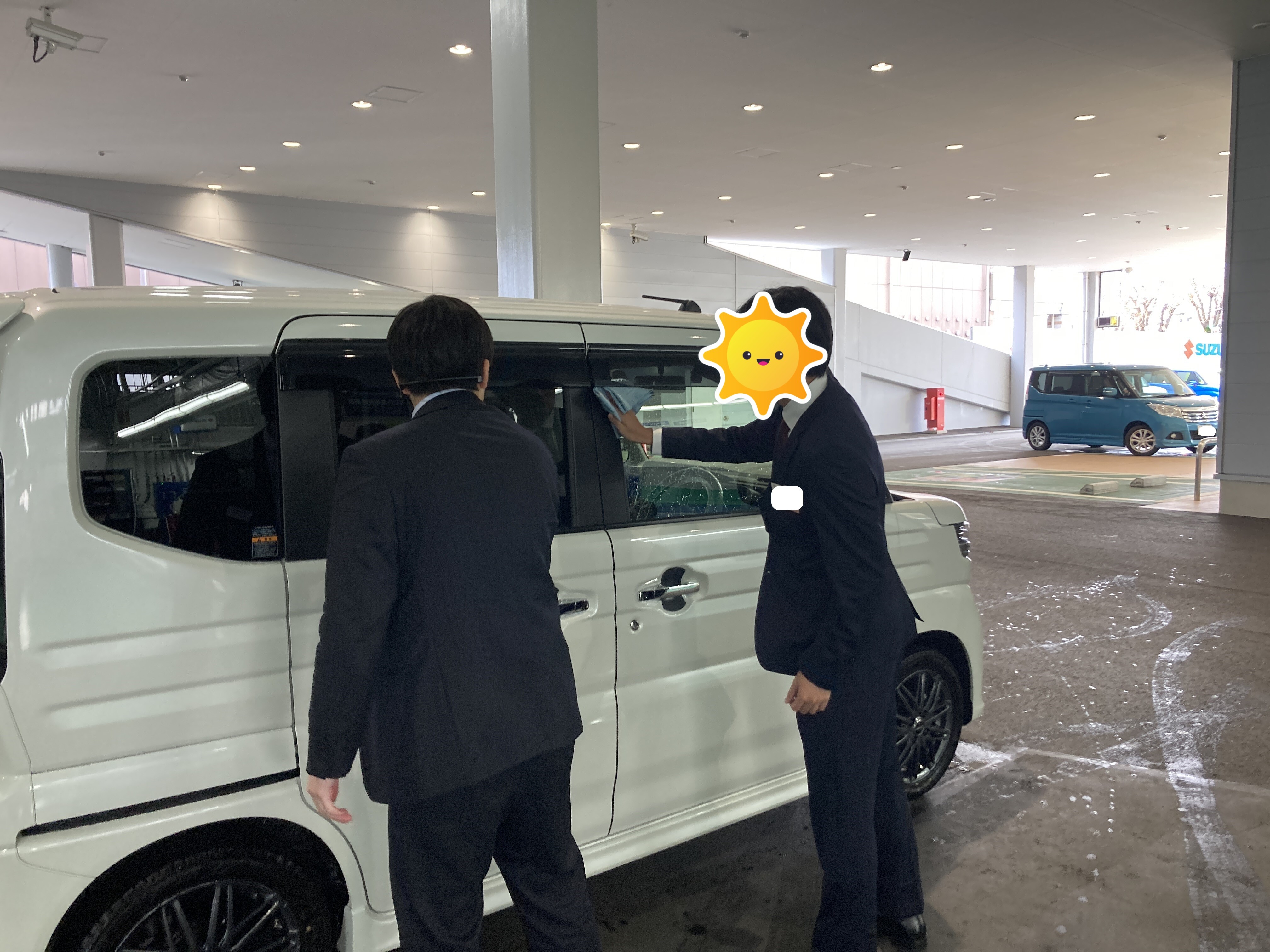 車検整備では、ブレーキ、足回り、エンジンルームを中心に先輩スタッフが作業しているところを見学しました。