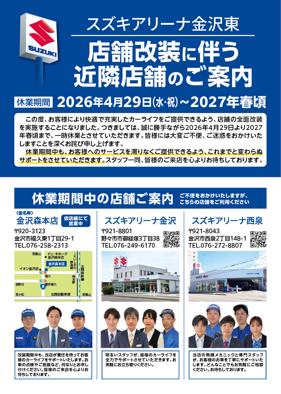 スズキアリーナ金沢東 店舗改装に伴う近隣店舗のご案内