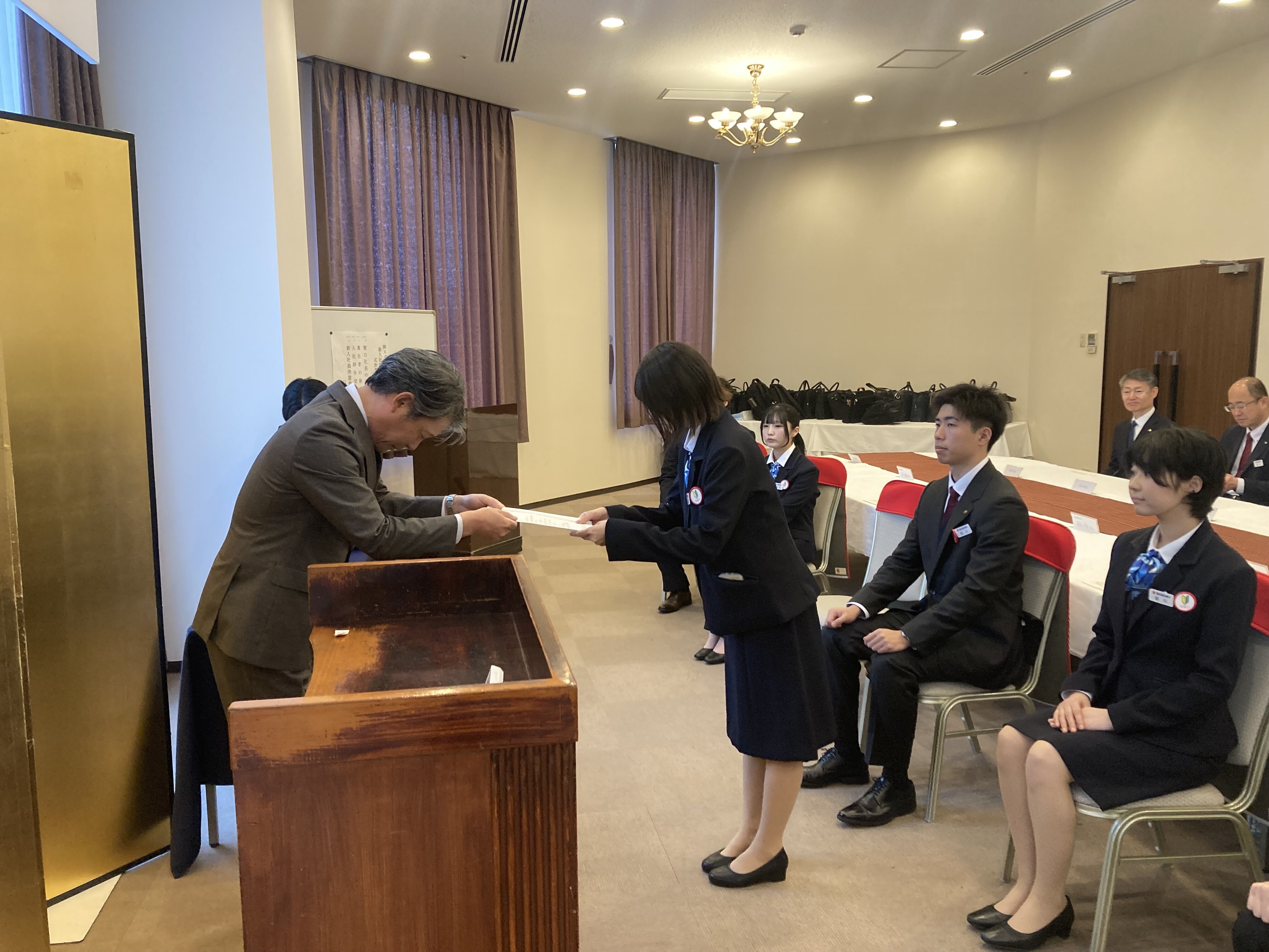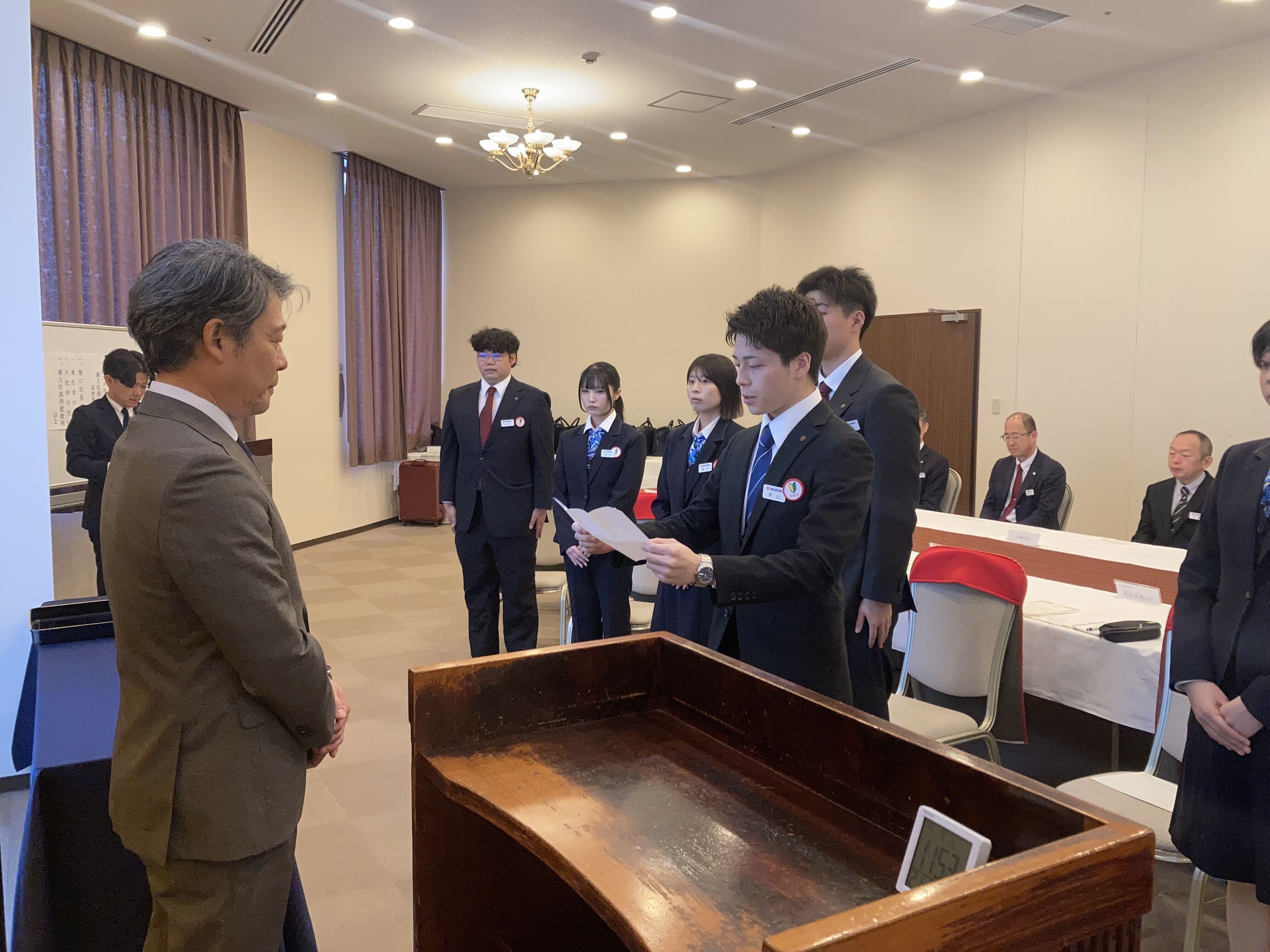 新入社員代表から決意表明「何事にも積極的に取り組み、向上心を持って邁進していくことを、ここにお誓い申し上げます」