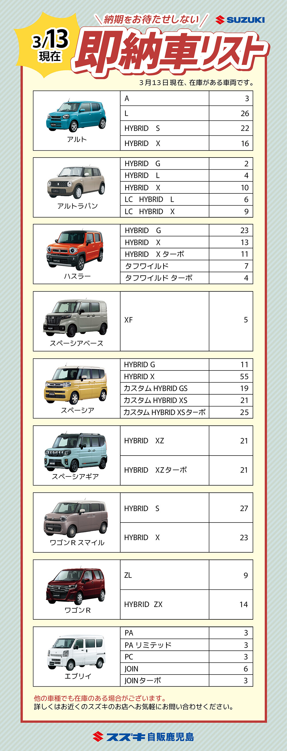 その他 2026.03.13 【3/13更新】すぐに乗ることが出来る!即納車あります♪ (株)スズキ自販鹿児島のホームページをご覧いただき、 誠にありがとうございます。 スズキ自販鹿児島にある即納車のご紹介です ※3/13 現在の在庫です※ 気になるお車がありましたら、 お気軽にお問い合わせくださいませ