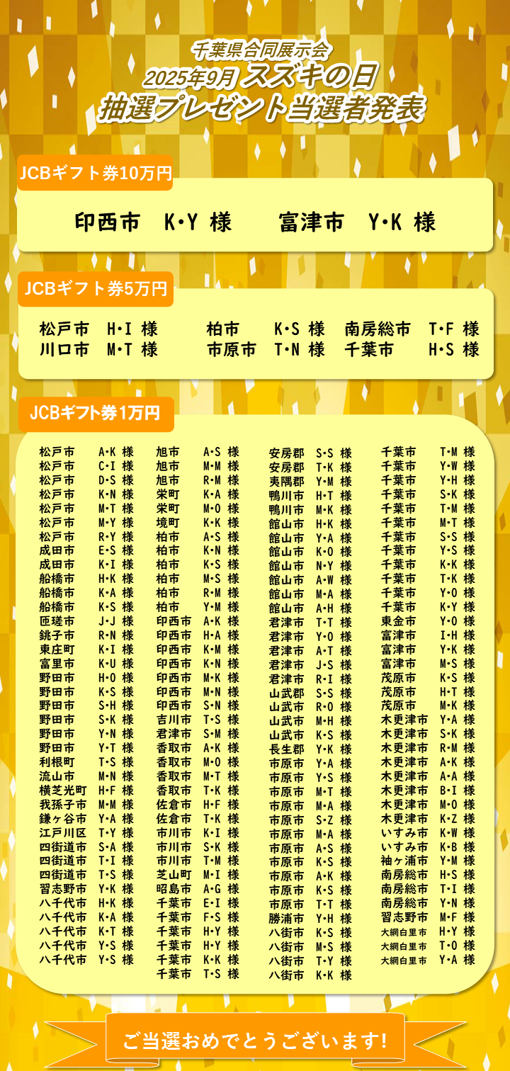 イベント/キャンペーン 2025.09.27 ☆☆☆25年9月 スズキの日 JCBギフト抽選結果発表します!!☆☆☆ 25年9月 スズキの日 JCBギフト券 抽選結果 発表します!! 2025年9月6日~7月15日 ス ズ キ の 日 大変多くのお客様にご来店いただきまして まことにありがとうございました! 当選者の方に!! 10万円ギフトカード 2名様 5万円ギフトカード 6名様 1万円ギフトカード 150名様 差し上げます~!! それでは当選者発表です!! ジャーン 以下の方々が当選しました!! おめでとうございます!!! ※表記は順不同です。 さぁ~ 該当イニシャルはありましたか 当選者の方には担当者よりご連絡を差し上げます~ 楽しみにしてお待ちください!!