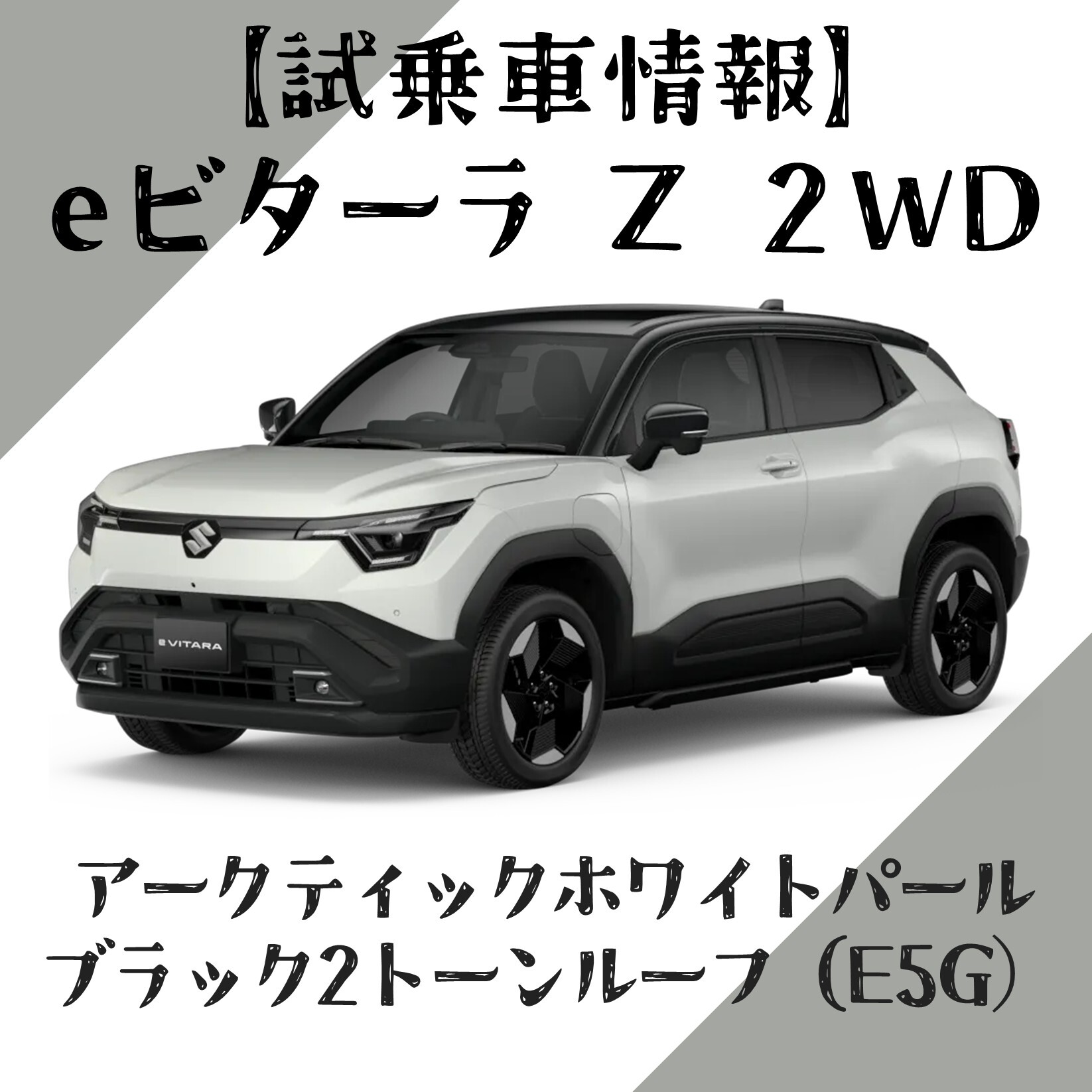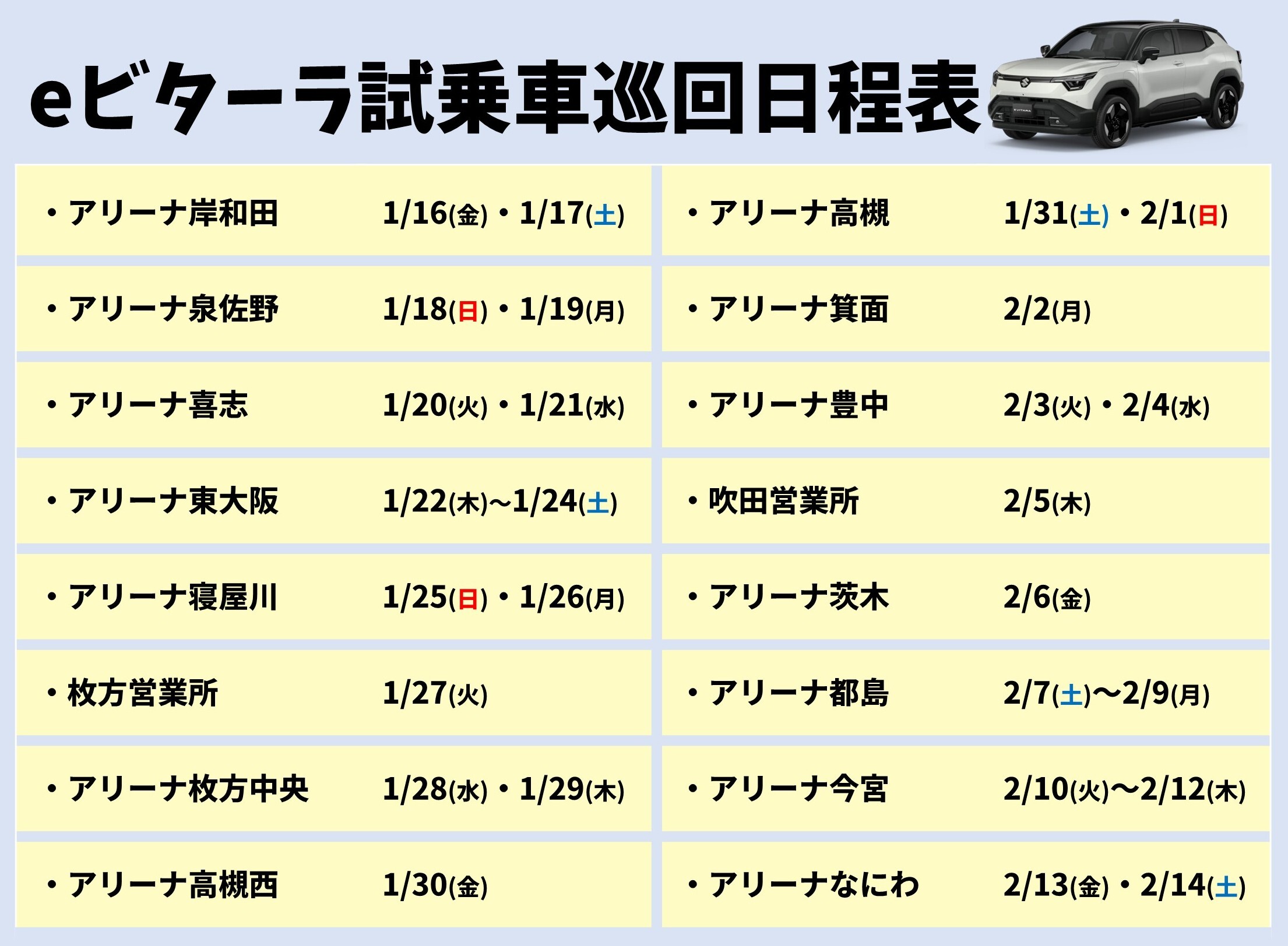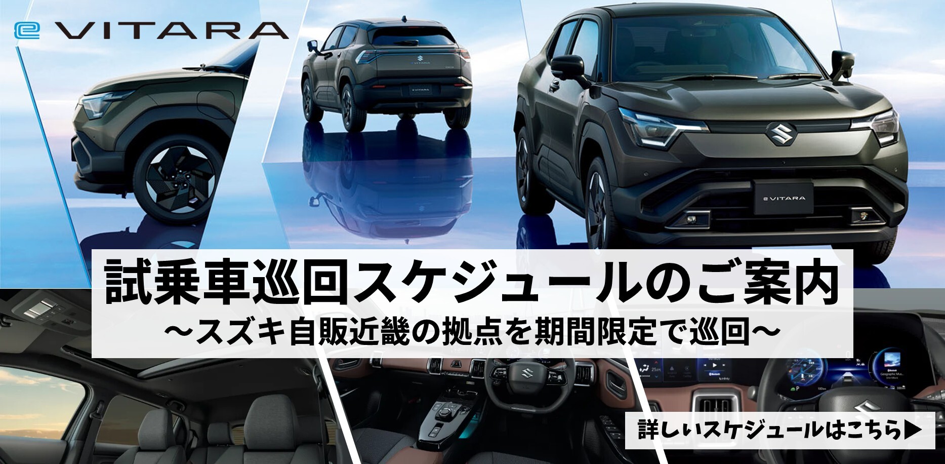 イベント/キャンペーン 2026.01.16 eビターラ試乗車巡回スケジュールのご案内 日頃よりスズキ自販近畿を ご愛顧頂きまして 誠にありがとうございます。 スズキ自販近畿にて 新型「eビターラ」の試乗車を 期間限定で巡回いたします。 お近くの店舗で 新型「eビターラ」を ご試乗できるチャンスです‼ お電話にて試乗ご予約下さいませ 皆さまのご来店をお待ちしております。