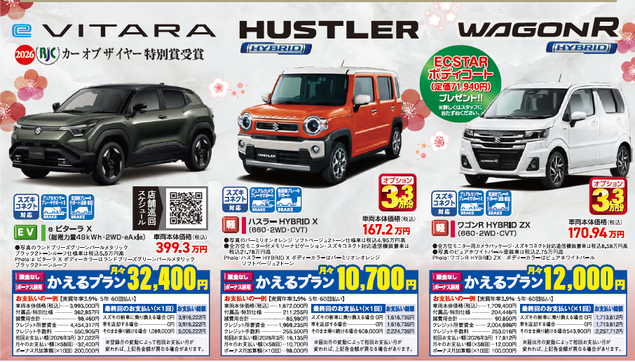 (eビターラ、フロンクス、ジムニーノマド、ジムニーシエラ、ジムニー、アルト、エブリイワゴン、商用車、福祉車両、京都限定車は対象外です。)