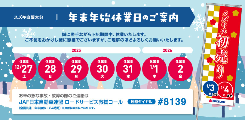 その他 2025.12.23 年末年始 休業のお知らせ 日頃はスズキ自販大分をご愛顧賜りありがとうございます。 誠に勝手ながら当社は 12月27日(土)より1月2日(金)までの期間、休業いたします。 誠に恐れ入りますが、上記期間中、お車の急な故障や事故の際には ◆JAF 日本自動車連盟◆ 電話番号 0570-00-8139 または 短縮ダイヤル #8139 までご連絡をお願いいたします。 1月3日(土)より初売り展示会を実施いたします。 皆様のご来店を心よりお待ちしております