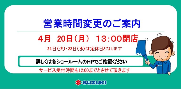 また、4月21日(火)・22日(水)は定休日となります