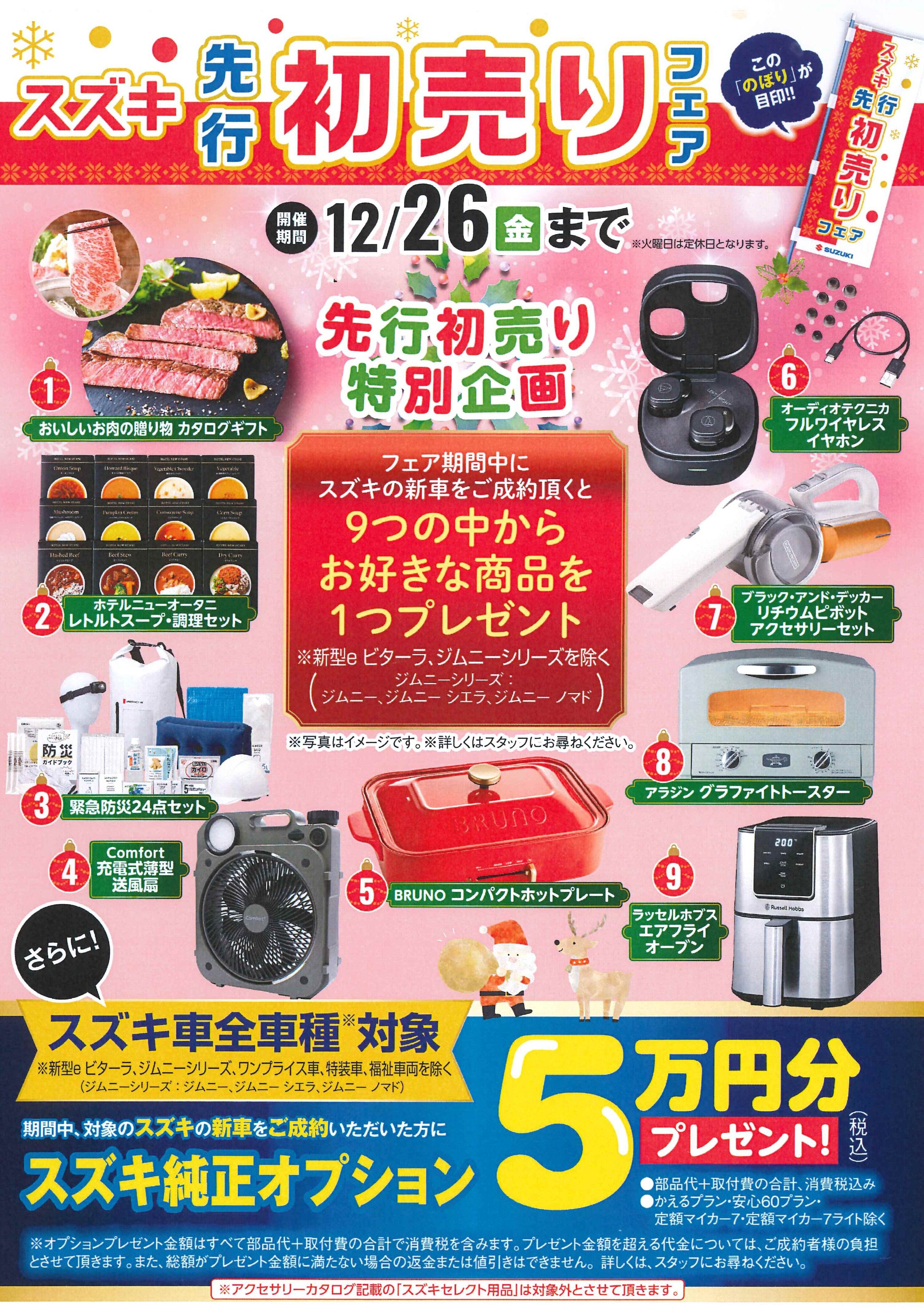 イベント/キャンペーン 2025.12.05 先行初売りフェア 開催中!! キャンペーン期間:2025.12.01~2025.12.26 スズキ自販東海をご愛顧いただきありがとうございます。 当社では「先行初売りフェア」を開催中です この期間中にスズキの新車(一部対象外あります)をご成約いただきますと 9つの中からお好きな商品をお一つプレゼントいたします!! さらにスズキ純正オプション5万円分プレゼント! 詳しくはスタッフまでお問い合わせください。 新型クロスビーやスペーシアなと人気のおクルマを試乗や見ていただけます。 ぜひこの機会にスズキ自販東海のお店にお越しください みなさまのご来店お待ちしております