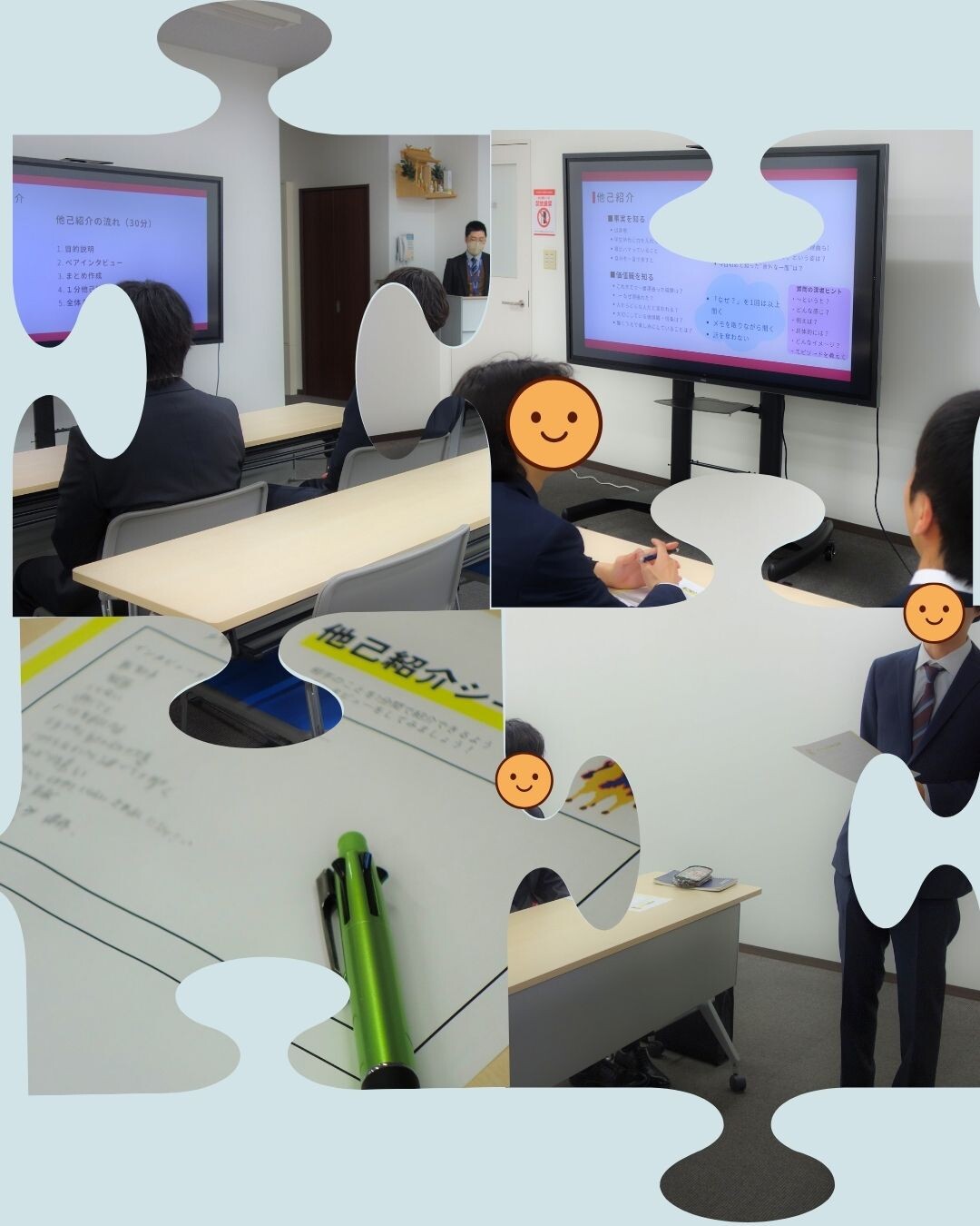 他己紹介では、ペアになって相手の話を聞き、その人のことをみんなに紹介します。