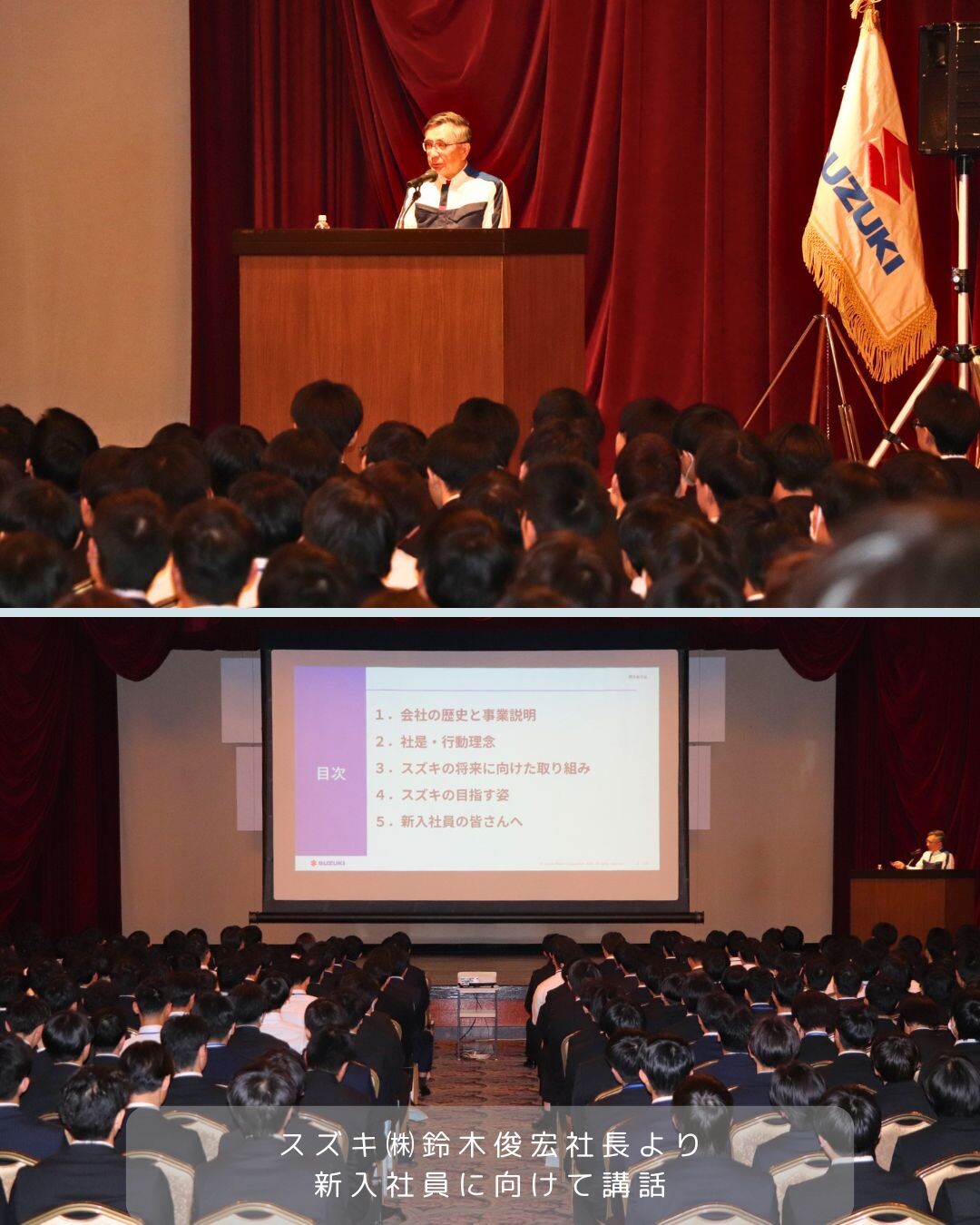 本式典では、スズキ株式会社 鈴木俊宏社長よりスズキのオペレーティングシステムである「社是」および「3つの行動理念」を基本に、現場での挑戦と行動を通じて『個の成長』を実現してほしい。