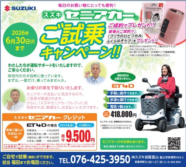 その他 2024.11.18 スズキのセニアカークレジット 始まりました! 買い物や散歩など日常の移動手段として ご利用いただけるセニアカーに今回、 スズキのセニアカークレジット が登場しました! セニアカーには、安心の 「障害物察知サポート」 付き! 「障害物察知サポート」とは・・・ センサーが前方の障害物を察知すると、 運転者に警告し、車両を減速させることで 安全運転をサポートします。 さらに 「LEDヘッドライト」 や 「速度抑制機能付クラッチ」 も新搭載! 座り心地も良くなり進化した スズキのセニアカーをぜひご覧ください! ▼セニアカーって何?詳しく知りたい! セニアカーとは 展示車の検索はこちらから ⇒展示車検索 今なら、 ご試乗キャンペーンも実施中! 2026年6月30日(火)まで! お気軽にご来店下さい。 また、スズキ自販富山では 専任のスタッフがご自宅まで お伺いもさせていただきますので、 店舗スタッフにご用命ください。 後日、専任スタッフよりご連絡させていただきます。 ご来店お待ちしております。