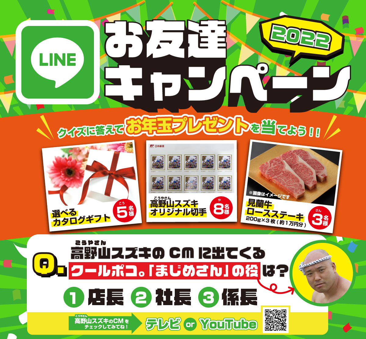 【注意事項】 当選者には、LINEにて1月末にご連絡させていただきます。その際に住所・氏名・電話番号をお知らせいただくことが景品発送の条件になります。景品発送先住所は山口県内に限らせていただきます。また、景品の発送先は応募されたご本人様以外に、親戚・ご友人宛に送付することが可能です。応募は1回のクイズ回答のみとさせていただきます。(複数回ご回答いただいても当選確率は変わりません) キャンペーン期間中に友達登録を解除・もしくはブロックされた場合は抽選対象となりませんのでご注意ください。