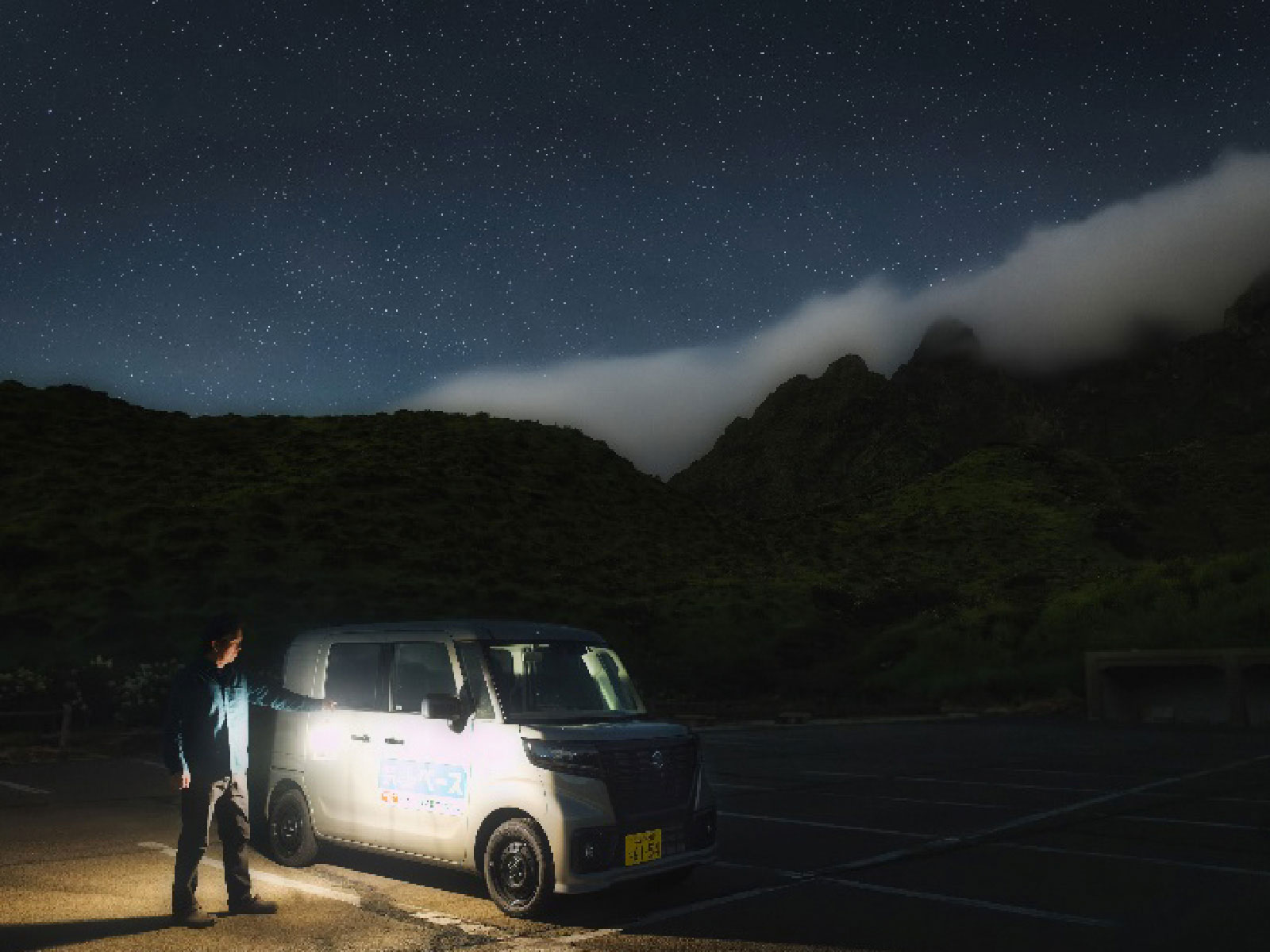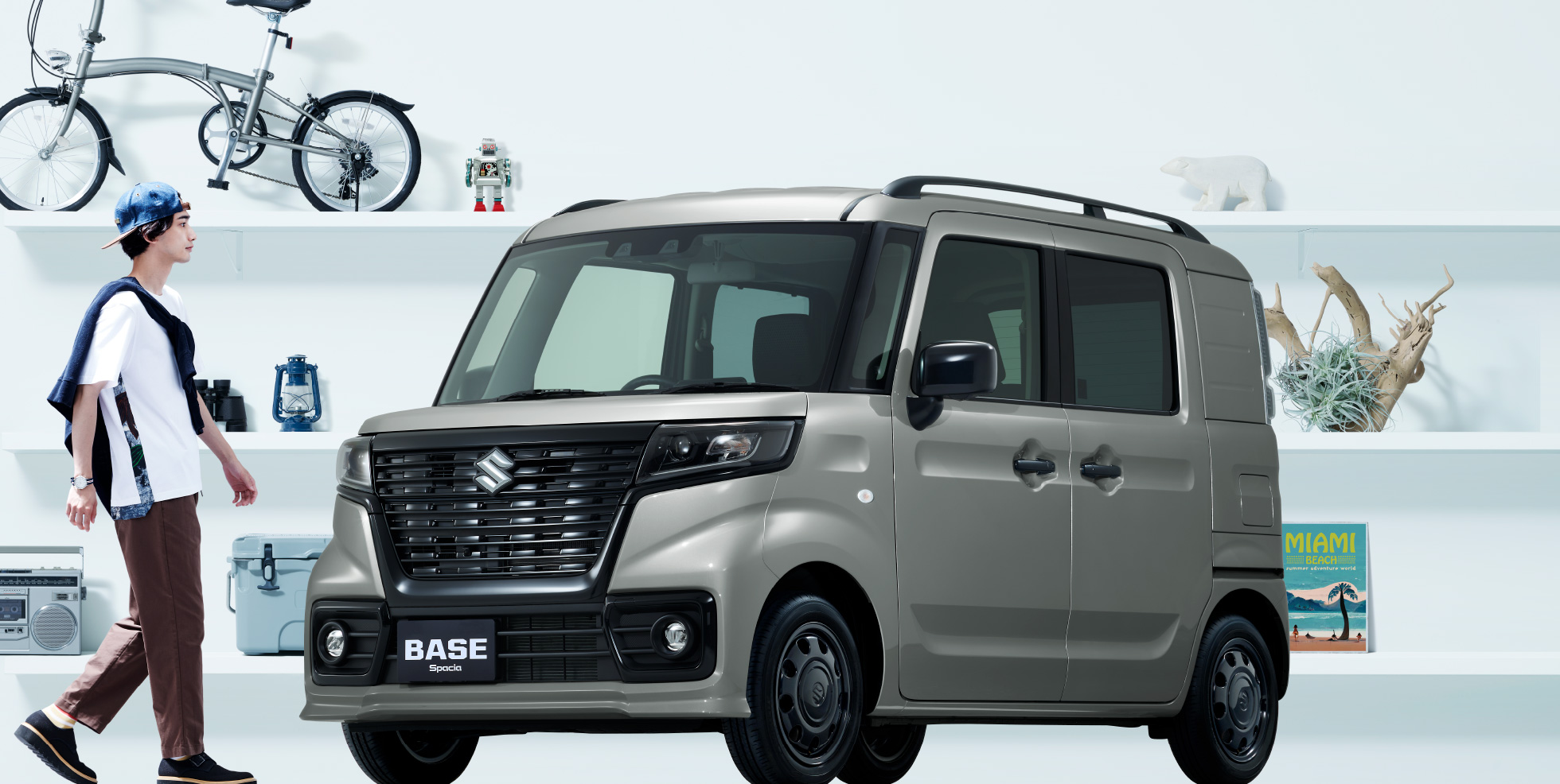 アリーナ博多 裏方の人 BASE×CAMP スペーシアBASEはキャンプに力を発揮します。 ・無骨なデザイン ・広い積載空間 ・力強い走り どこをとっても満点です! ※写真中の小物は、撮影のための小道具です。 マルチボードを有効活用 マルチボード上段モードにすることで軽い荷物を上段に、重い荷物を下段に分けて積載できます。 荷室開口高が1,115mmで、後方視界を遮らずにたくさん積載できます。 ※マルチボード耐荷重:最大12kg(上段モード、停車時のみ) ※マルチボードを上段モードにて走行する際は、付属のマルチボード固定用ネットを使用してください。 ※写真中の小物は、撮影のための小道具です。走行中は、荷物が移動し、運転の支障とならないようしっかりと固定または収納してください。 重量物積載はスライドドアが便利 スライドドア開口幅が600mmでスライドドア側からの重量物の乗せ下ろしが楽々です。 ※マルチボード耐荷重:最大12kg(上段モード、停車時のみ) ※マルチボードを上段モードにて走行する際は、付属のマルチボード固定用ネットを使用してください。 ※写真中の小物は、撮影のための小道具です。走行中は、荷物が移動し、運転の支障とならないようしっかりと固定または収納してください。 キャンプ場に映えるデザインとカラー どこか無骨なデザインは”自分だけの移動基地”にぴったり。 カラーはハイビジビリティからロービジビリティまで5色を展開で自分のキャンプスタイルに合わせて選べます。 ※写真中の小物は、撮影のための小道具です。 お気に入りのギア 約90年前のランタン。まだまだ現役で暖かい明かりを灯します。 スズキはそれ以上の100年の歴史があり、100年の技術がスペーシアBASEに搭載されています。 ※写真中の小物は、撮影のための小道具です。 夜も映えるBASE 夜空のブルーグラデーションとスペーシアBASEは相性抜群! 特にブラックメッキのフロントマスクが夜に映えます。 ※写真中の小物は、撮影のための小道具です。 日常を忘れてチルタイム 好きな飲み物と好きなお菓子でチルタイム。 ※写真中の小物は、撮影のための小道具です。 夜空のブルーグラデーションもキャンプの醍醐味 背の高い建物や電線がない空は広く感じます。 キャンプ場近隣には生活の明かりもないので月あかりや星がきれいに見えます。 ※写真中の小物は、撮影のための小道具です。