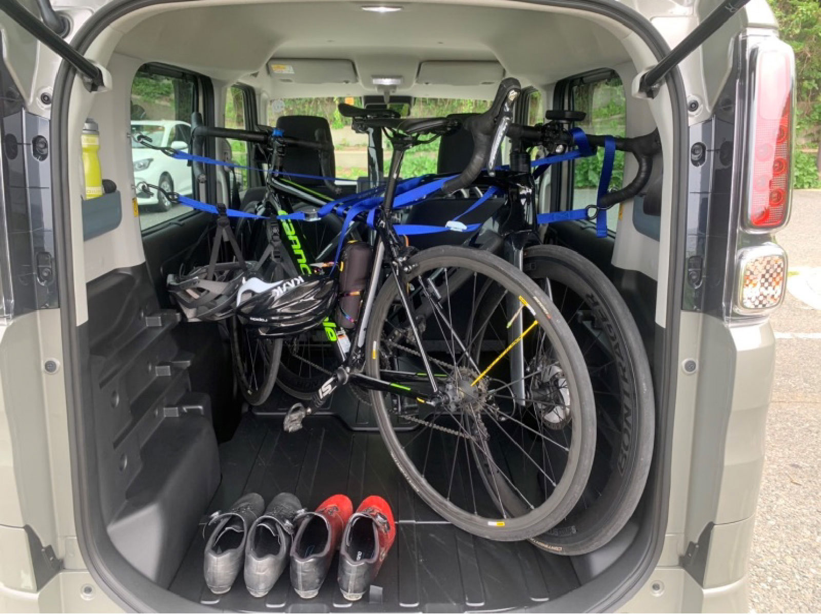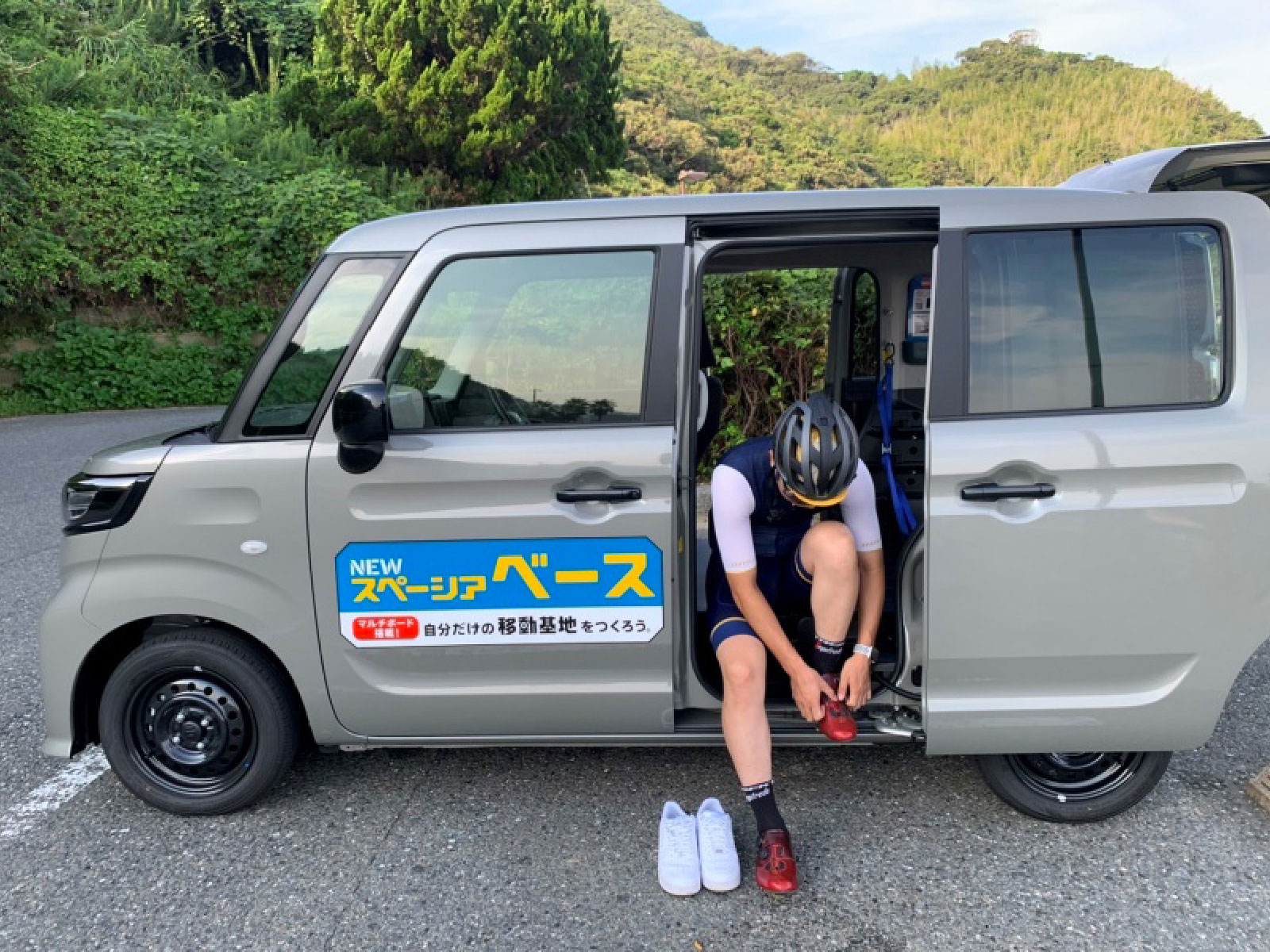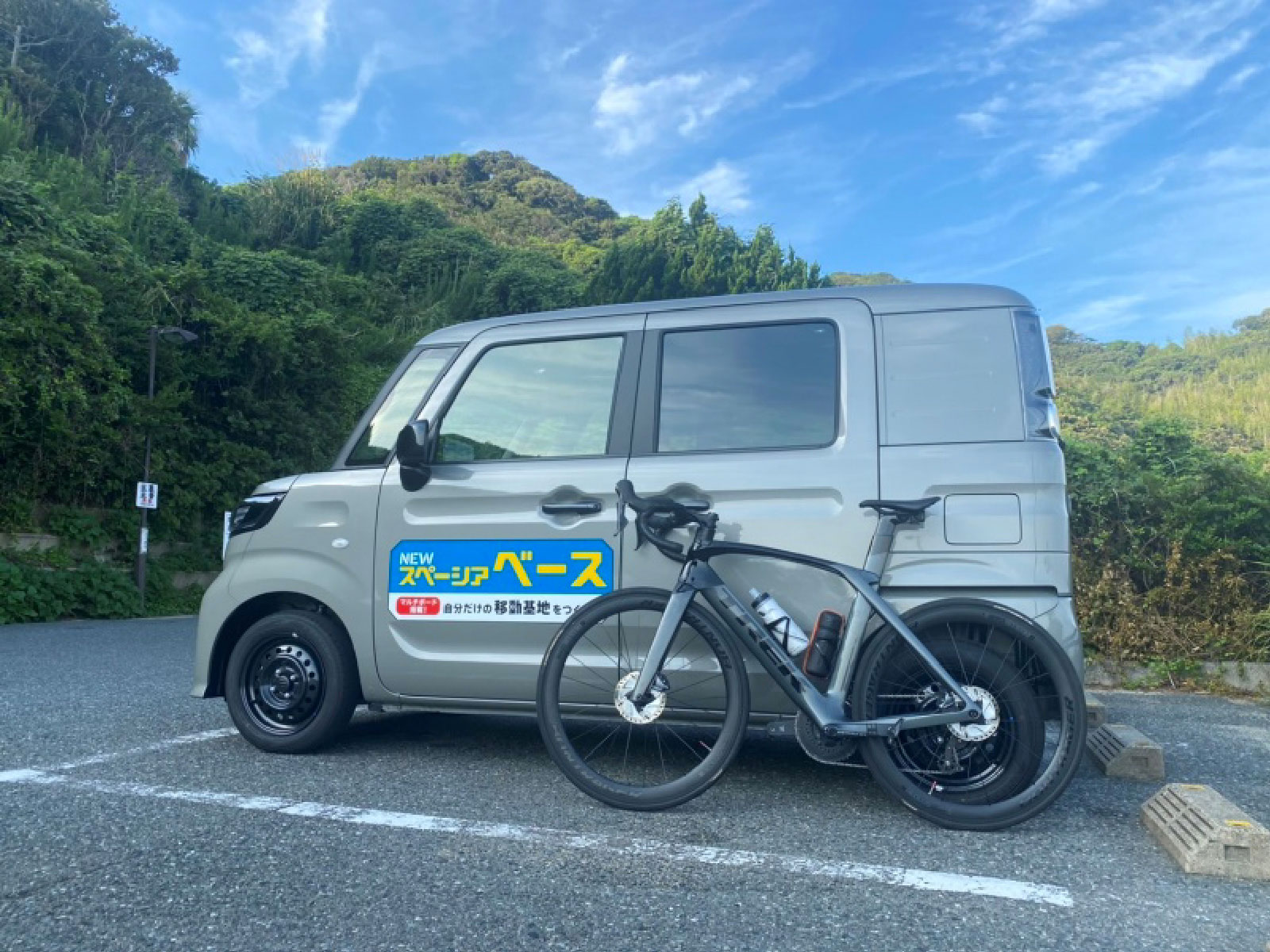 久留米店 いのうえ・つだ BASE×BIKE ロードバイクを積載してスタート地点の駐車場まで。 今回は糸島~唐津間を走ります! 自転車のカラーとBASEのモスグレーメタリックの色合いが絶妙にマッチしていたので記念撮影しました! ※写真中の小物は、撮影のための小道具です。 BASEにロードバイク2台積んでみた! タイヤを外さずに載せられるのでロードバイクを降ろしたらすぐに走り出せます! オプションのラゲッジベルト、ユーテリティカラーリングフックを使用することでしっかり固定でき、高速道路を使用しても全然問題ありませんでした! ※ラゲッジベルト・ユーティリティーカラーリングフックは販売会社装着アクセサリー(別売)です。 ※自転車のサイズや形状によっては積載できない場合があります。 ※写真中の小物は、撮影のための小道具です。走行中は、荷物が移動し、運転の支障とならないようしっかりと固定または収納してください。 積載も掃除もらくらく! BASEのバックドアを開けると、車輪を乗せて積みやすくしてくれる窪みがあるので自転車の積載が楽です! また、防汚タイプラゲッジフロアなので汚れても綺麗に掃除できます! ※自転車のサイズや形状によっては積載できない場合があります。 ※写真中の小物は、撮影のための小道具です。走行中は、荷物が移動し、運転の支障とならないようしっかりと固定または収納してください。 痒いところに手が届く! 何かと小物が多いロードバイク。 荷物がごちゃごちゃするのが悩みでした。 リヤクォーターポケットが左右にあるおかげでスッキリ収納できました! ※写真中の小物は、撮影のための小道具です。走行中は、荷物が移動し、運転の支障とならないようしっかりと固定または収納してください。 ここをBASE(基地)とする! 専用シューズに履き替え。 スライドドアなので駐車場が狭くても楽々履き替えできました! ※写真中の小物は、撮影のための小道具です。 絶景!虹の松原サイクリング 佐賀県唐津市の虹の松原です。 車では何度か来たことはありましたが、自転車で走るととても気持ち良かったです! 快調にペダルを回します。 目的地まであと少し! ※写真中の小物は、撮影のための小道具です。 絶品!唐津バーガー ライド後のご褒美として唐津バーガーを頂きました! 運動したあとのハンバーガーは絶品です! このご褒美の為にロードバイクをしていると言っても過言ではありません。(笑) ※写真中の小物は、撮影のための小道具です。 ゴールの記念撮影 走行距離75キロ、コースのほとんどが海沿いで気持ちの良いコースでした! BASEがあれば、いつもと違う道を走れるのでロードバイクの楽しさを再発見できました。 次は阿蘇ヒルクライムに挑戦してみようかと思います! ※写真中の小物は、撮影のための小道具です。