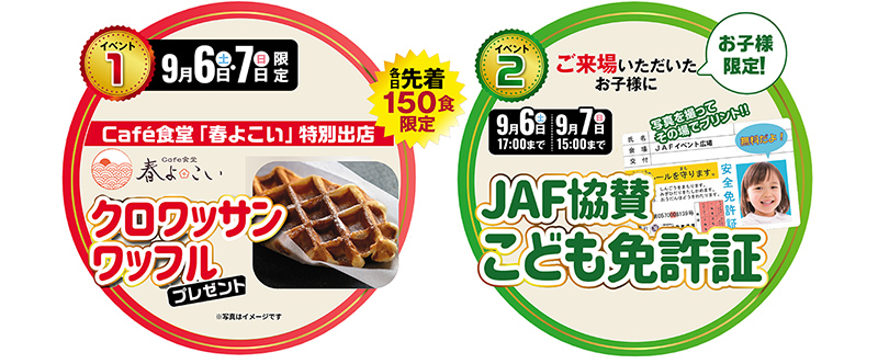 クロワッサンワッフル出店やJAFこども免許証はこの2日間のみです!