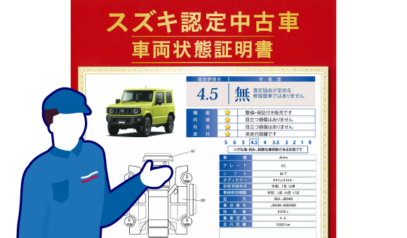 「スズキ認定検査員」による、メーカーと一般財団法人日本自動車査定協会の厳しい基準でチェックした内容を「車両状態証明書」で公開。購入前に車両状態をしっかり確認できるので安心です。