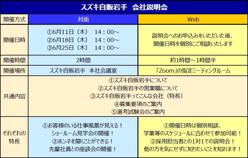 スズキ自販岩手では、2021年3月卒業の方向けの「営業職 会社説明会」を開催しております。