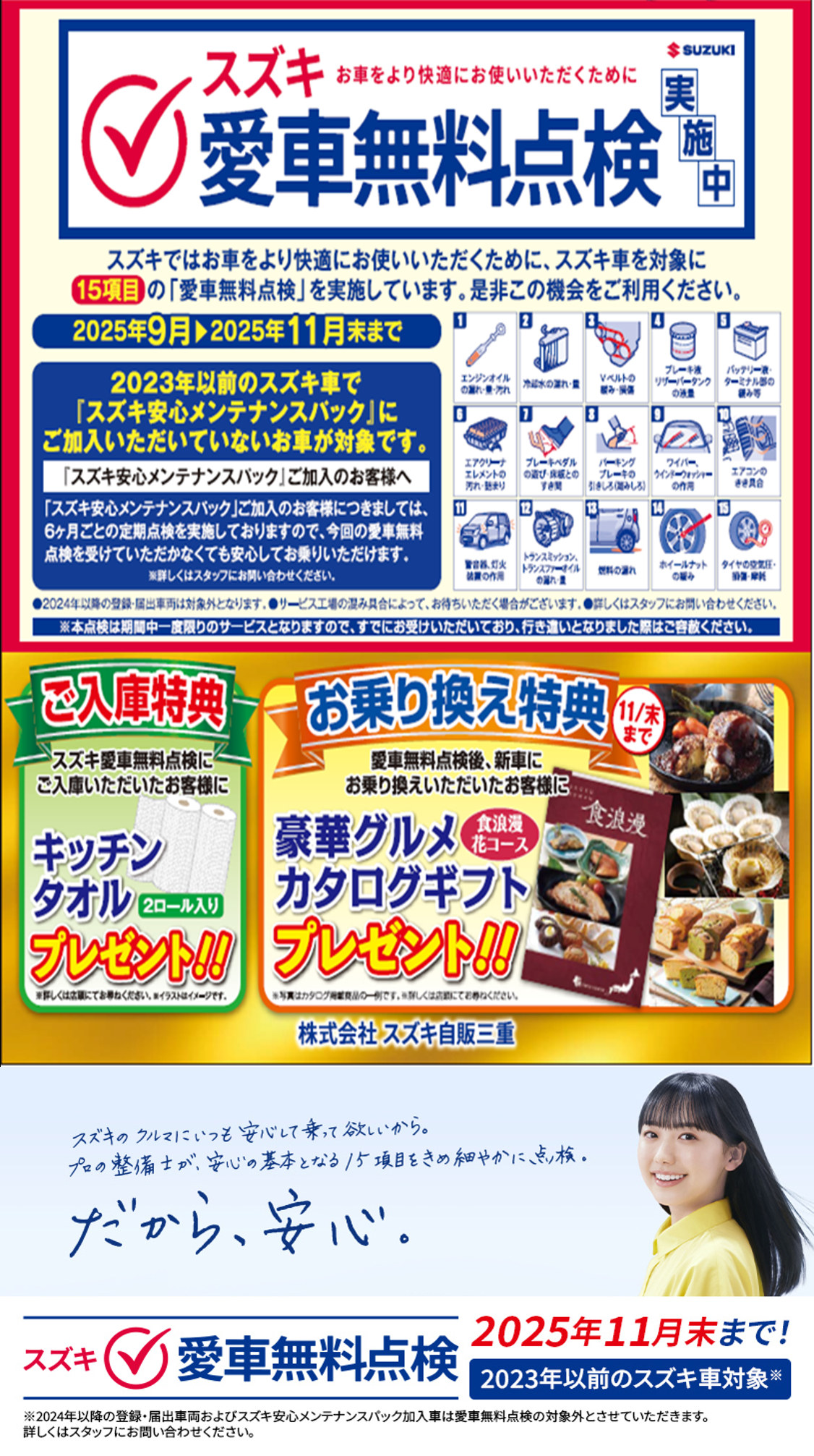 その他 2025.11.24 愛車無料点検あと1週間となりました! いつもスズキ自販三重ホームページをご覧いただき、 誠にありがとうございます 愛車無料点検があと1週間で終了となります。 今年もたくさんのお客様にご来場いただきましてありがとうございました おクルマ購入ご検討の方、愛車無料点検をこれから受けようかお考えの方、 11月末まで開催しておりますので、是非ご検討ください! ご来場心よりお待ちしております