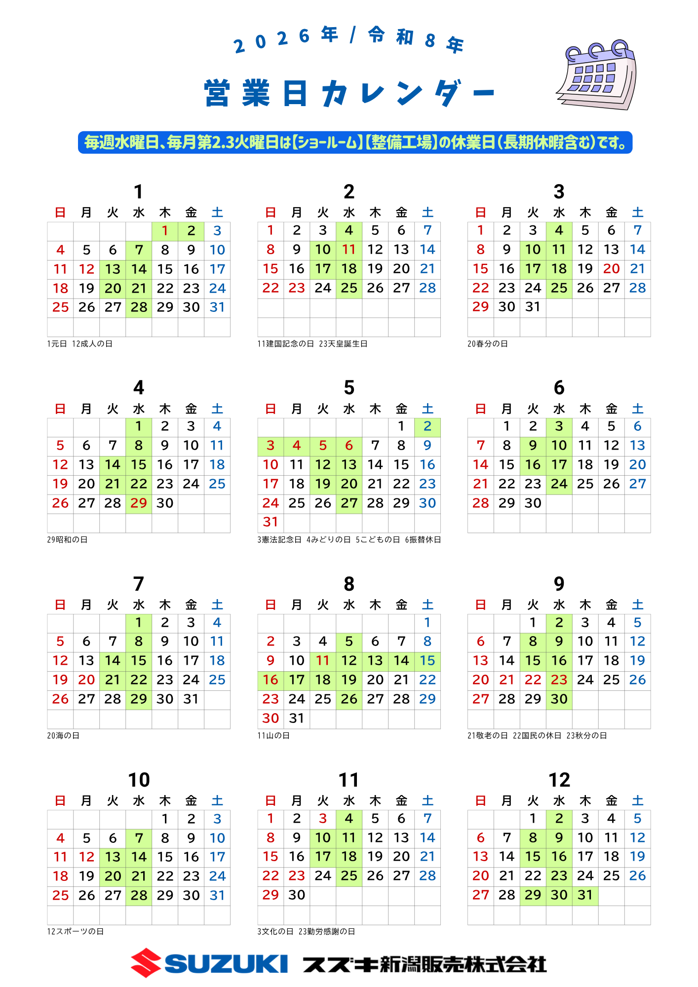 その他 2025.11.15 ■□■ 2026年 営業日のお知らせ ■□■ いつもスズキ新潟販売のホームページをご覧いただき有難うございます。 2026年(令和8年) 営業日についてお知らせ致します。 カレンダー黄緑の日は、【ショールーム】【整備工場】の休業日です。 定休日・夜間・長期連休の対応は、ご加入の任意保険ロードサービスまたは 【JAF】https://jaf.or.jp/common/call-road-serviceをご利用ください。 ご不便をおかけし誠に恐縮ですが、ご理解のほど、宜しくお願い申し上げます。