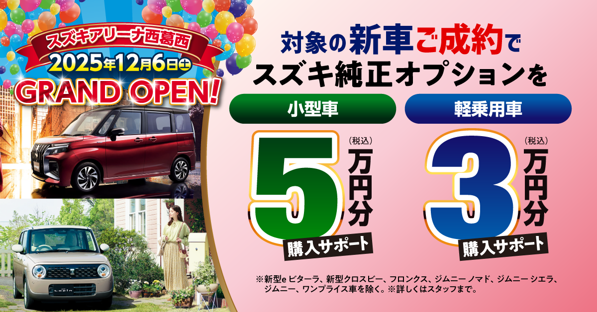 期間中対象の新車をご成約頂いた方に『最大5万円のスズキ純正オプション』と