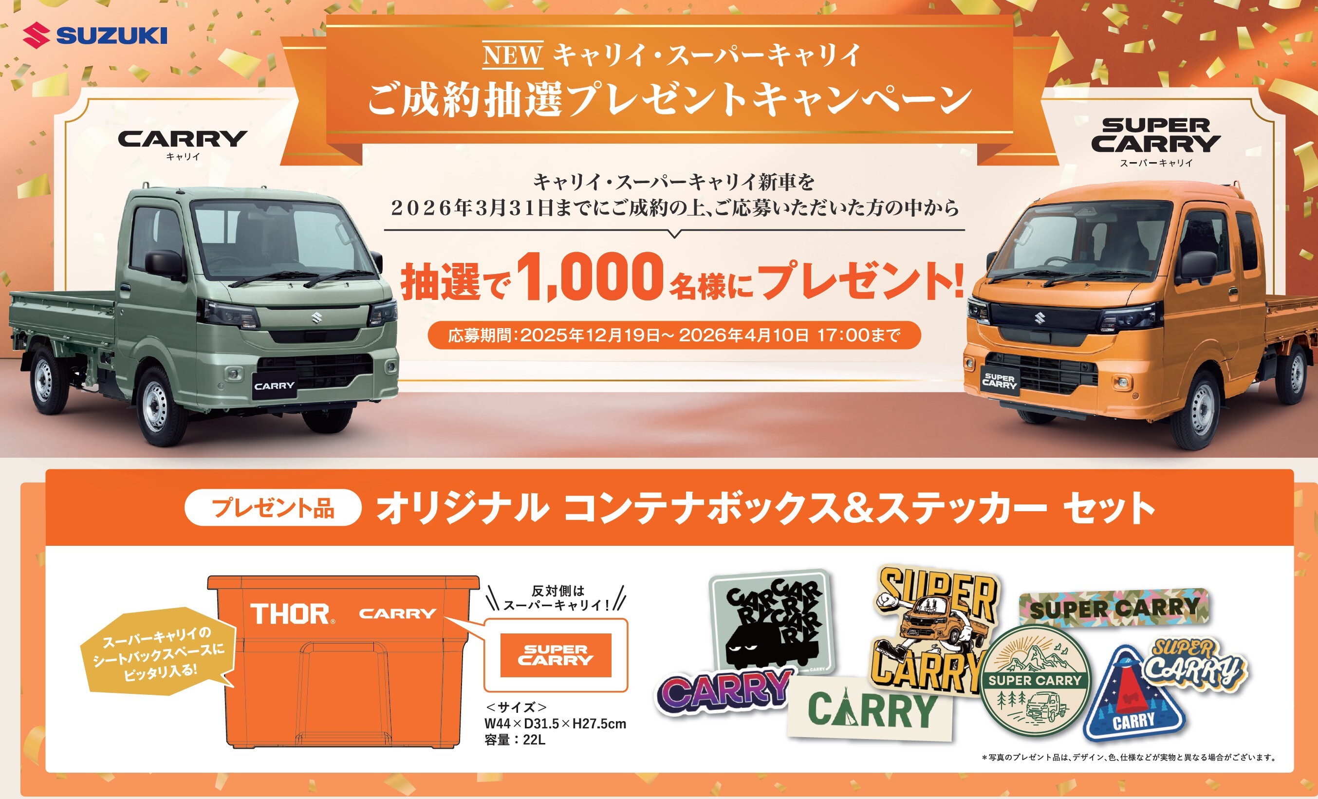 イベント/キャンペーン 2026.02.16 ♪♬キャリィ・スーパーキャリィ プレゼントキャンペーン♬♪ こんにちは 東武スズキ販売、春日部本社です いつもご覧頂きありがとうございます 只今、NEW キャリィ・スーパーキャリィ 新車をご成約頂いた方に抽選で オリジナルコンテナボックス&ステッカー セットをプレゼント ※応募期間:2025年12月19日~2026年4月10日 17時まで 皆様のご来店、スタッフ一同心よりお待ちしております
