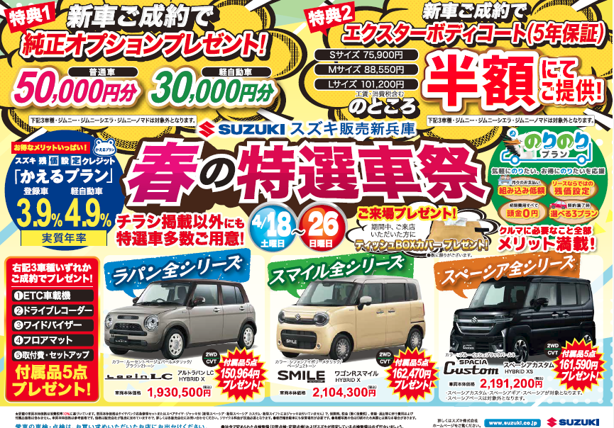 イベント/キャンペーン 2026.04.17 春の特選車祭始まります♪ 皆さまこんにちは いつもやしろインター店のブログをご覧いただき ありがとうございますございます 春の特選車祭 明日よりスタートいたします 開催期間は 4/18(土) ~ 4/26(日) 新車ご成約プレゼント 純正オプションプ 普通車・・・50,000円 軽自動車・・・30,000円 エクスターボディコート半額 などなどお得がいっぱいです ぜひこのお得な機会をお見逃しなく