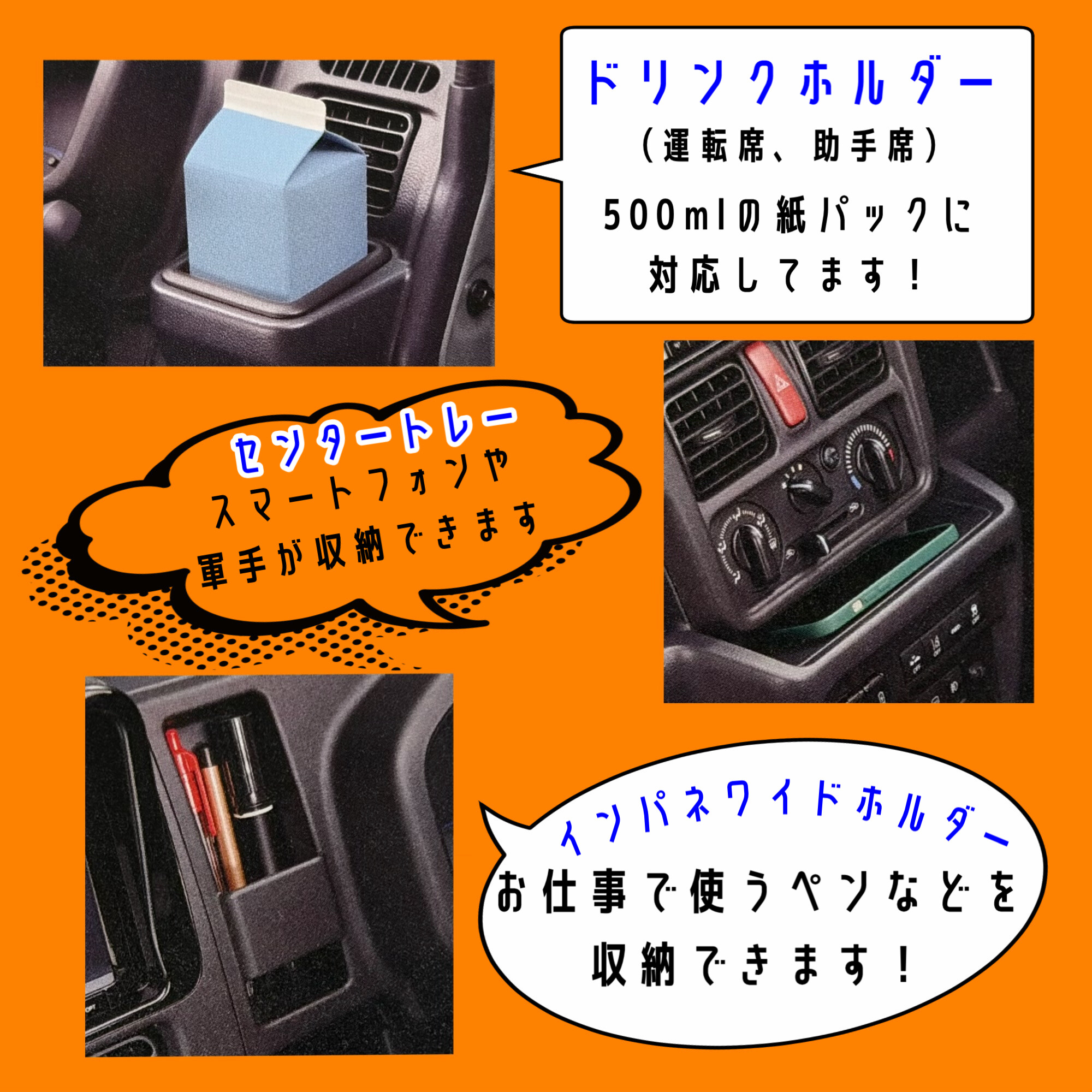 また、スマートフォントレーや紙パック対応ドリンクホルダーなど、
