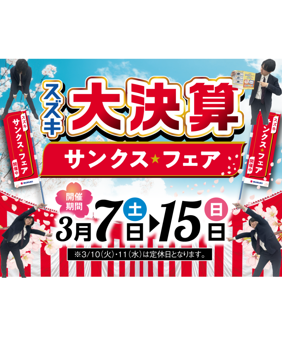 イベント/キャンペーン 2026.03.02 サンクスフェア始まります! いつもスズキ自販福岡アリーナ合川のホームページをご覧いただきありがとうございます。 早いものでもう3月に入ってしまいました 来月からは新年度が始まってしまいますね スズキでは3月にサンクスフェアを開催します 新車をご成約いただいた方にはオプションプレゼントもございます! さらに商談いただいた方限定でブランケットをお渡しします 試乗車もたくさん準備しておりますので みなさまのご来店をぜひお待ちしております