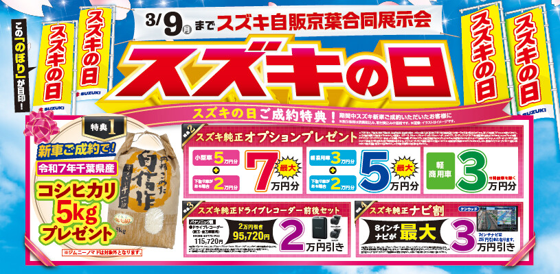 イベント/キャンペーン 2026.03.05 スズキの日!ラストスパート! キャンペーン期間:2026.03.05~2026.03.09 こんにちは 花粉が本気を出してきた今日この頃、、、。 花粉に負けず私たちも毎日頑張ります スズキの日もあと4日! 最終日まで元気に全力で駆け抜けます!! 軽商用車3万円 軽乗用車最大5万円 小型車最大7万円 オプションプレゼントなど お得なご成約特典があるこの機会をお見逃しなく さ ら に かえるプラン特別金利 3月31日お申込み分までです 対象車種:ソリオ クロスビー スペーシア 皆さまのご来店お待ちしております