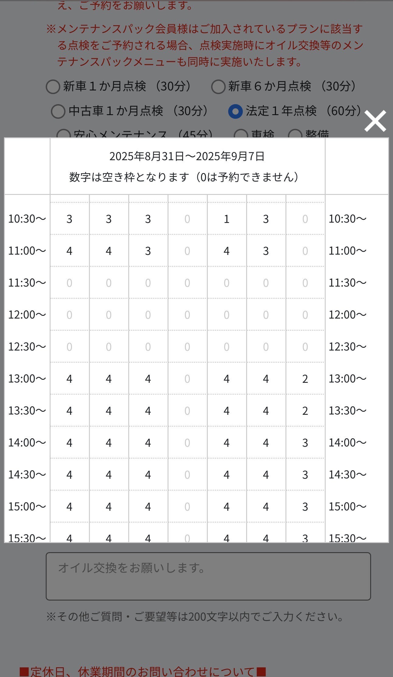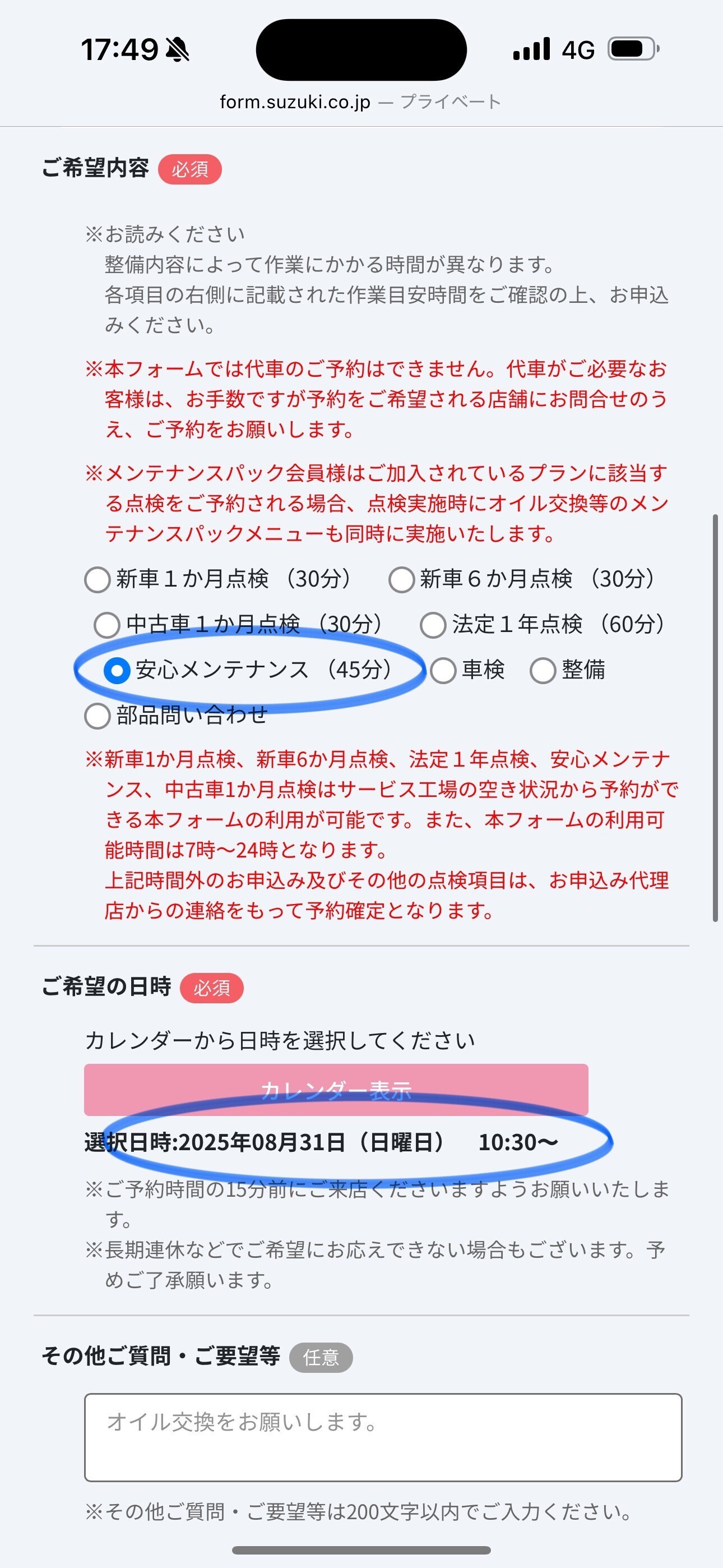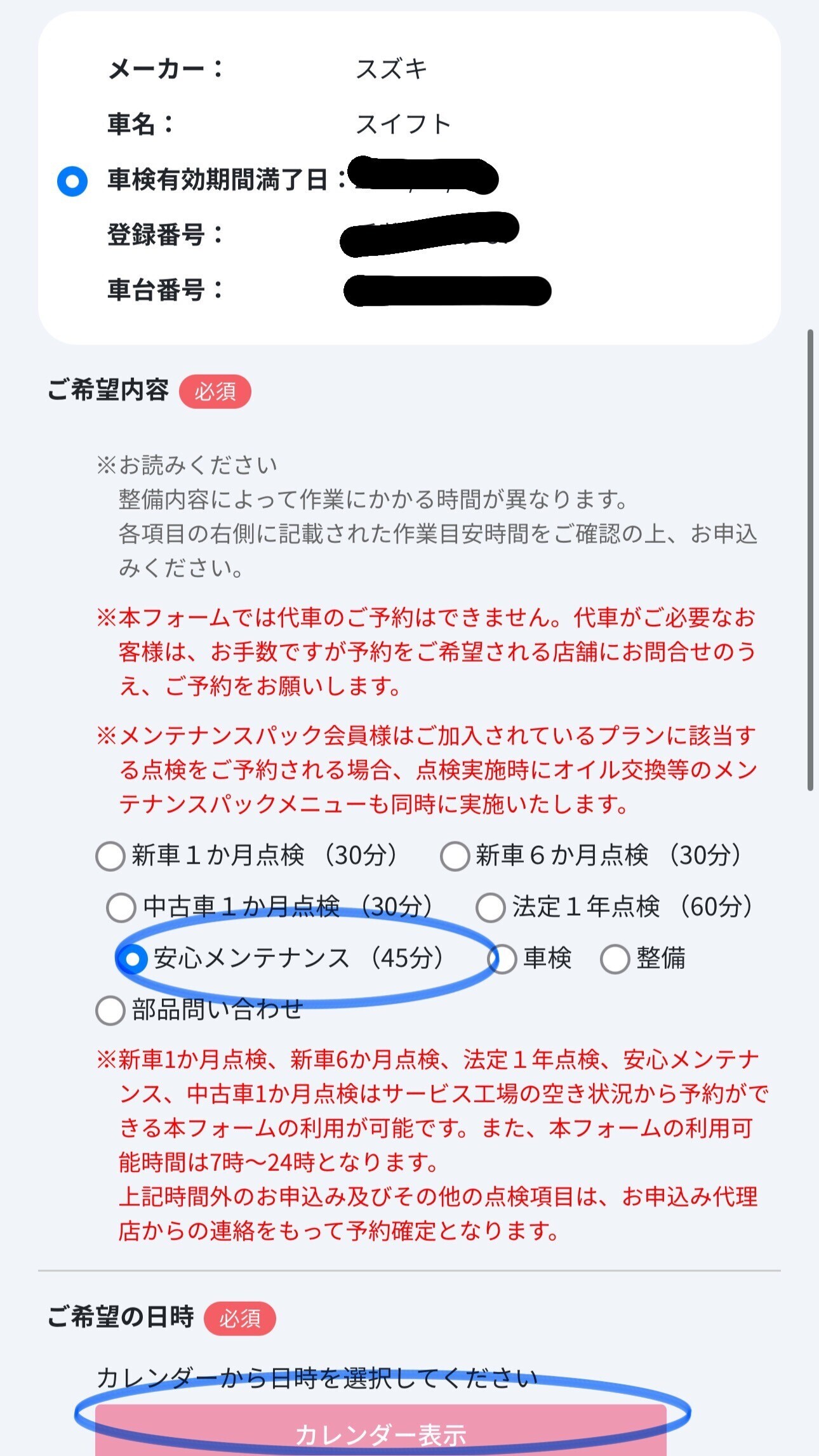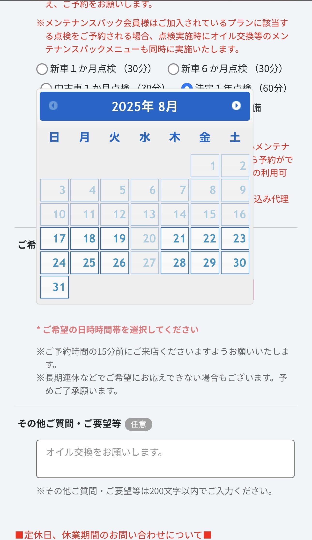 点検内容、希望日、希望時間が選択されてることを確認
