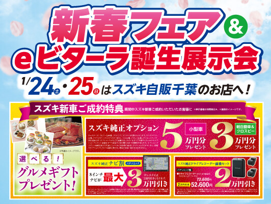 イベント/キャンペーン 2026.01.22 新春フェア&eビターラ誕生展示会開催します! キャンペーン期間:2026.01.24~2026.01.25 24日25日 新春フェア&eビターラ誕生展示会開催いたします! eビターラの 購入プラン、充電設備等について お気軽にご相談ください! また現在スズキ安心メンテナンスパック付き 残価設定クレジット・かえるプラン 車種別で特別低金利実施中! 通常金利3.9%のところ 3月31日までの申込で2.9%に引き下げ中です! 詳しい内容や車種についてはスタッフまでお問い合わせください! みなさまのご来店を、ぜひお待ちしております!