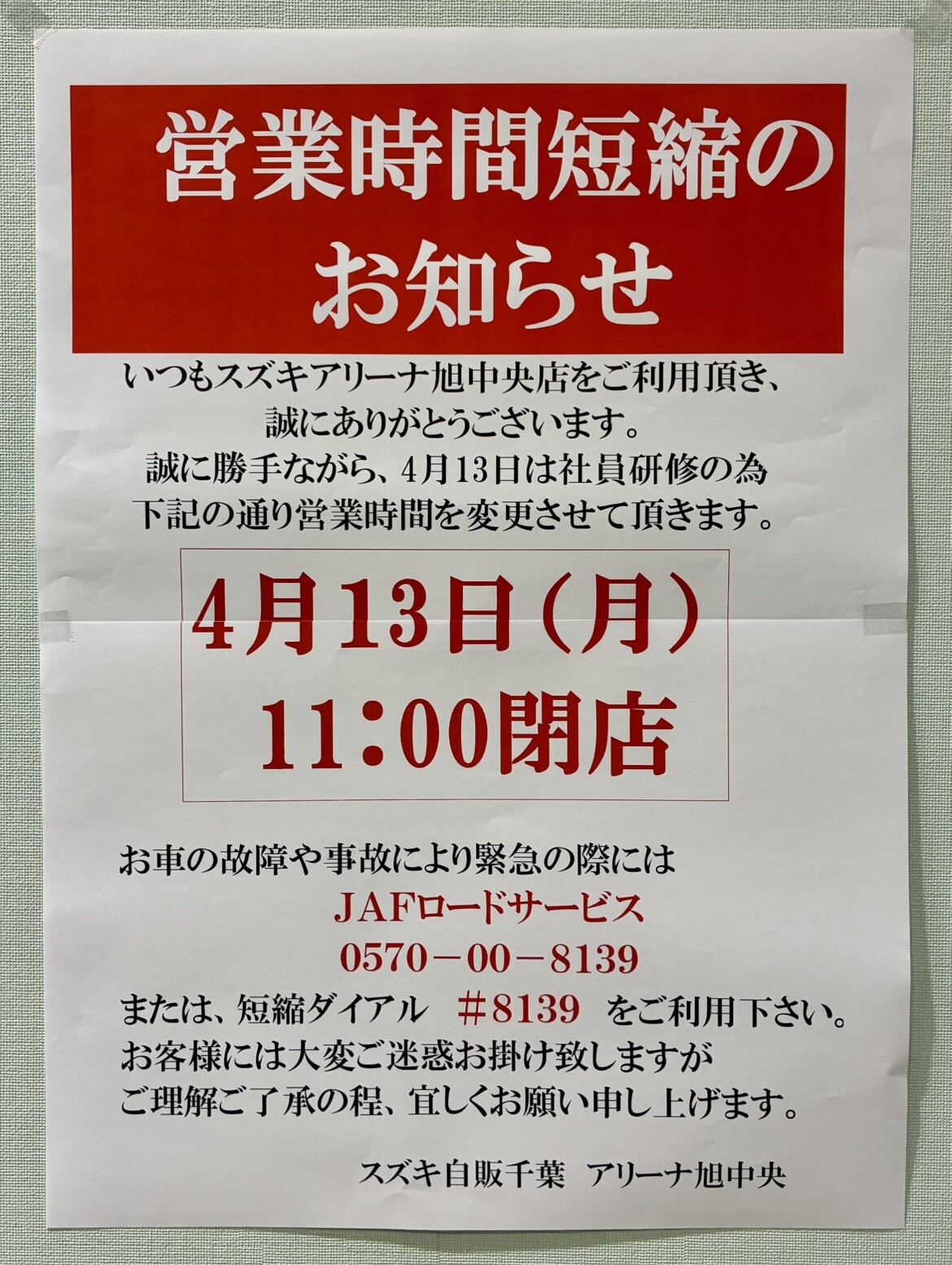 その他 2026.04.12 <<営業時間短縮のお知らせ>> 平素よりご愛顧賜りありがとうございます。 誠に勝手ながら4月13日(月)は社員研修のため 営業時間を変更致します。 4月13日(月) 11:00 閉店 お車のトラブル等、緊急の際には JAFロードサービス 0570ー00-8139 または、短縮ダイアル #8139 をご利用ください。 大変ご迷惑をお掛け致しますが ご理解ご了承の程、よろしくお願い致します。