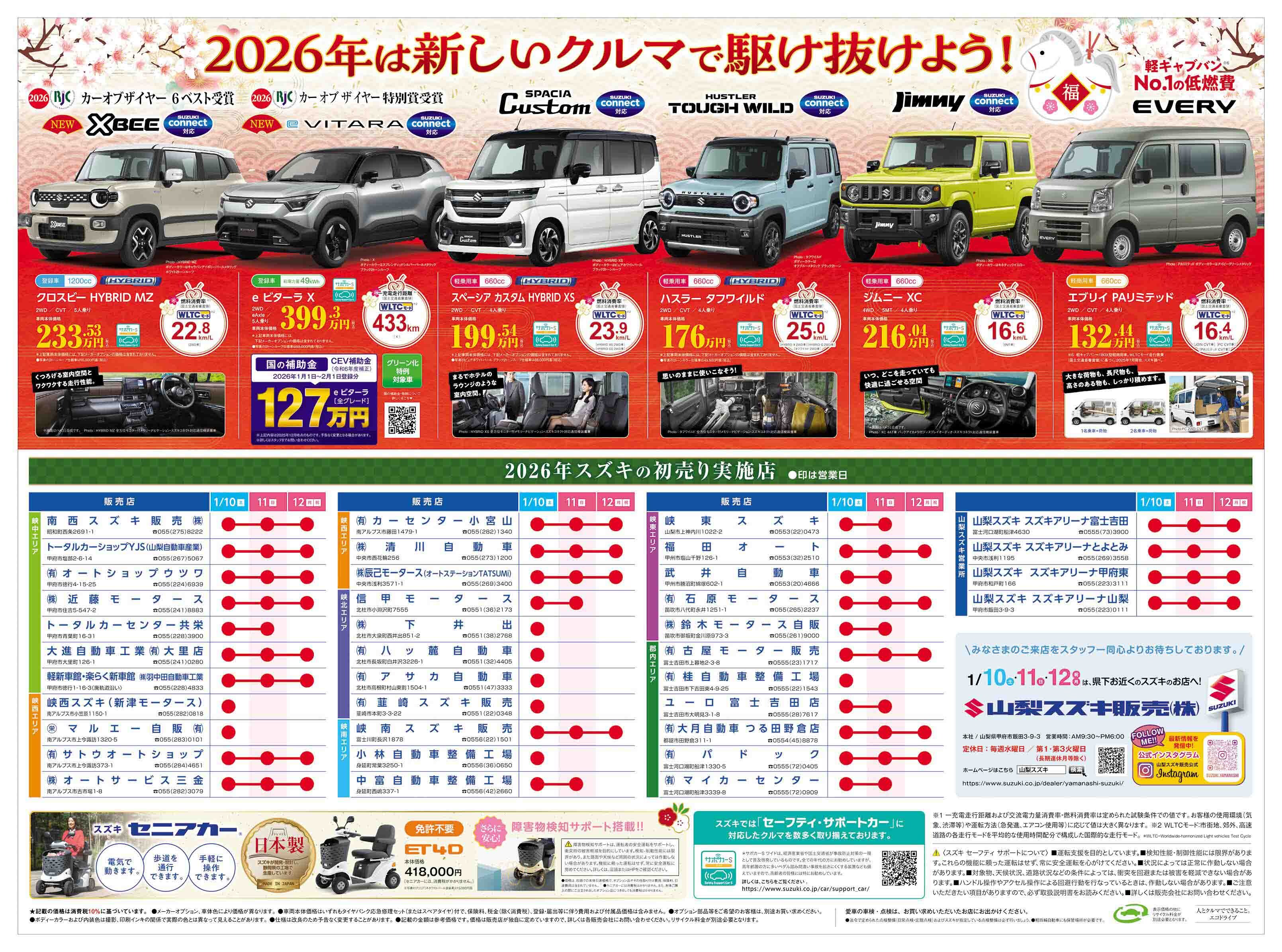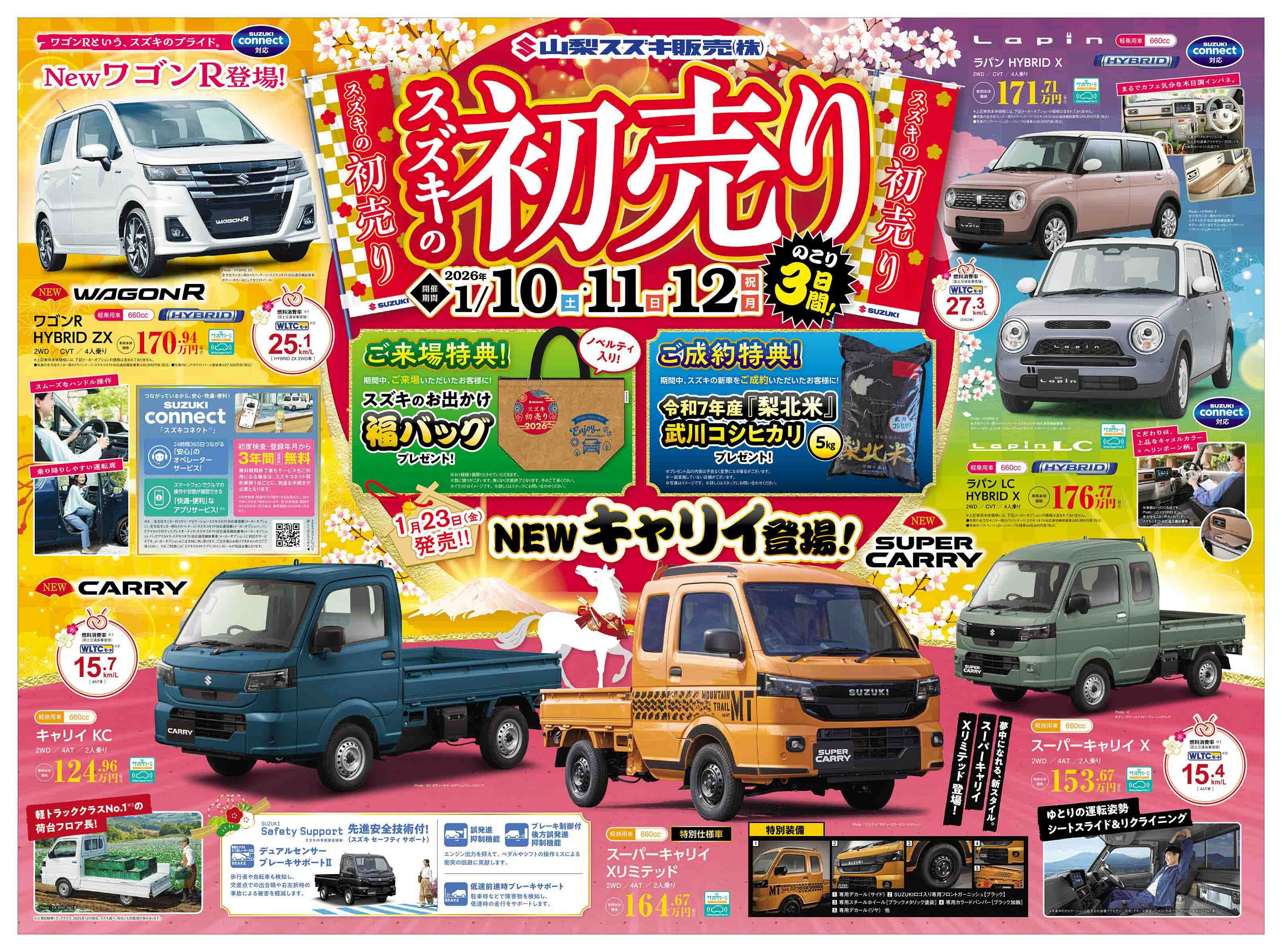 イベント/キャンペーン 2026.01.10 2026年1月10日(土)山日新聞・読売新聞、折り込みチラシ掲載 新聞広告 折込チラシ スズキの初売り 残り3日!! 12日(祝月)まで開催! 詳しくはこちら↓↓をご覧ください 新年を 新しいクルマで スタートしませんか? ご来店お待ちしております みなさまにとって 素敵な一年となりますように スズキがスキ 今年も共に駆けていこう