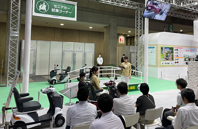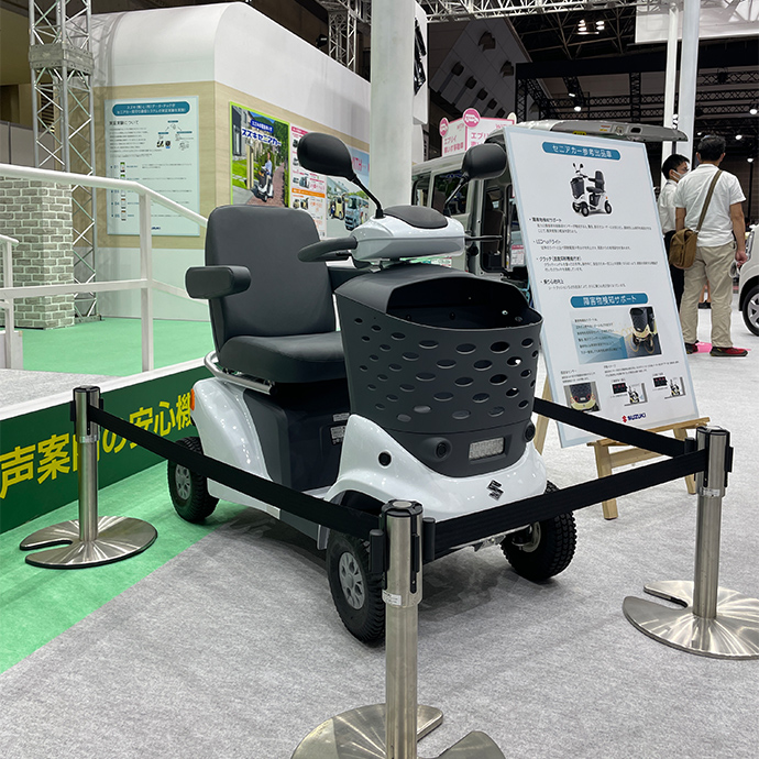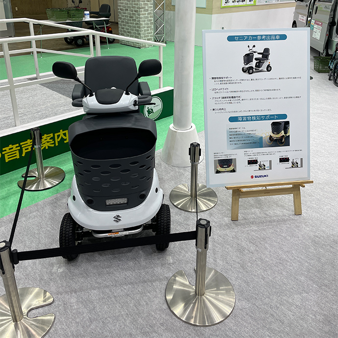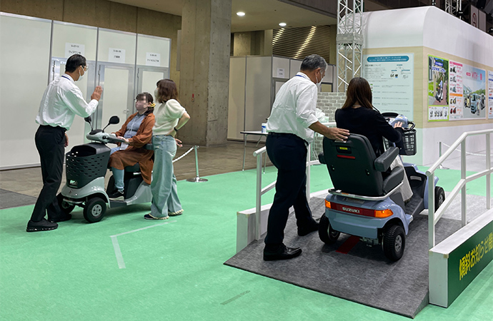 スズキブースでは、セニアカー試乗コーナーを設置し、セニアカーに採用されている傾斜お知らせ機能や音声案内などの安全機能を実際に体験していただきました。