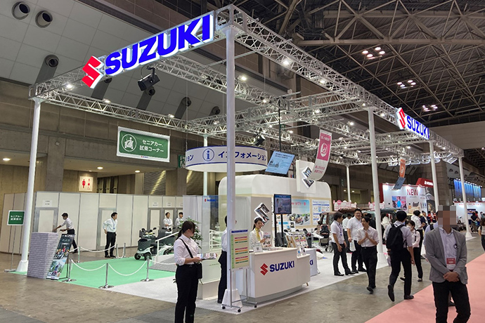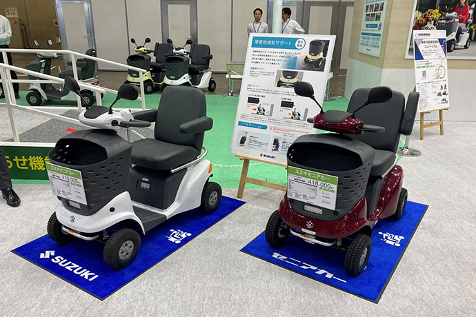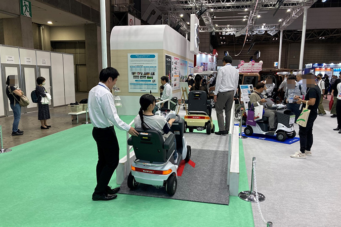 スズキブースでは、セニアカー試乗コーナーを設置し、セニアカーに採用されている「障害物検知サポート」や「傾斜お知らせ機能」、「音声案内」などの安全機能を体験していただきました。