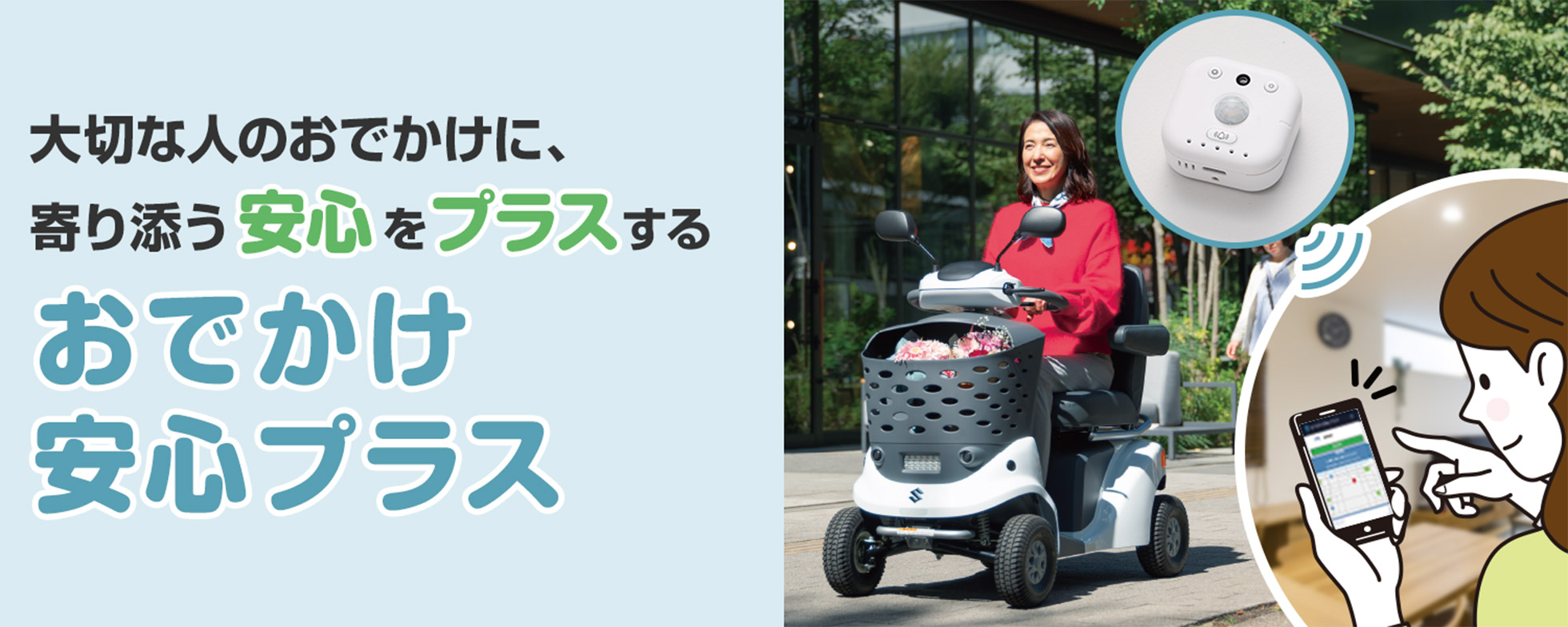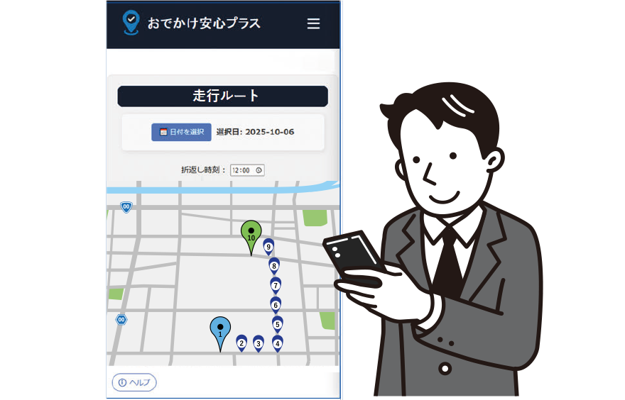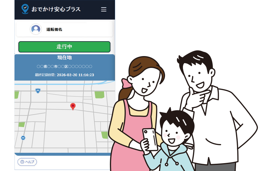 専用WEBアプリ「おでかけ安心プラス」により、セニアカーの現在地がご家族のスマートフォンにて確認可能