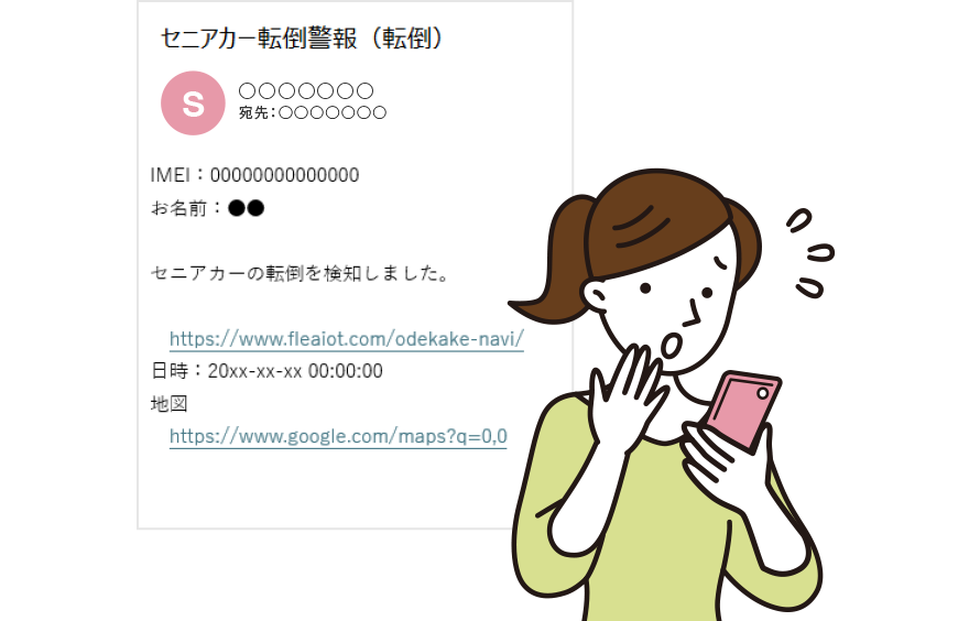 万が一の転倒を検知した場合、ご登録のメールアドレスへ自動で通知